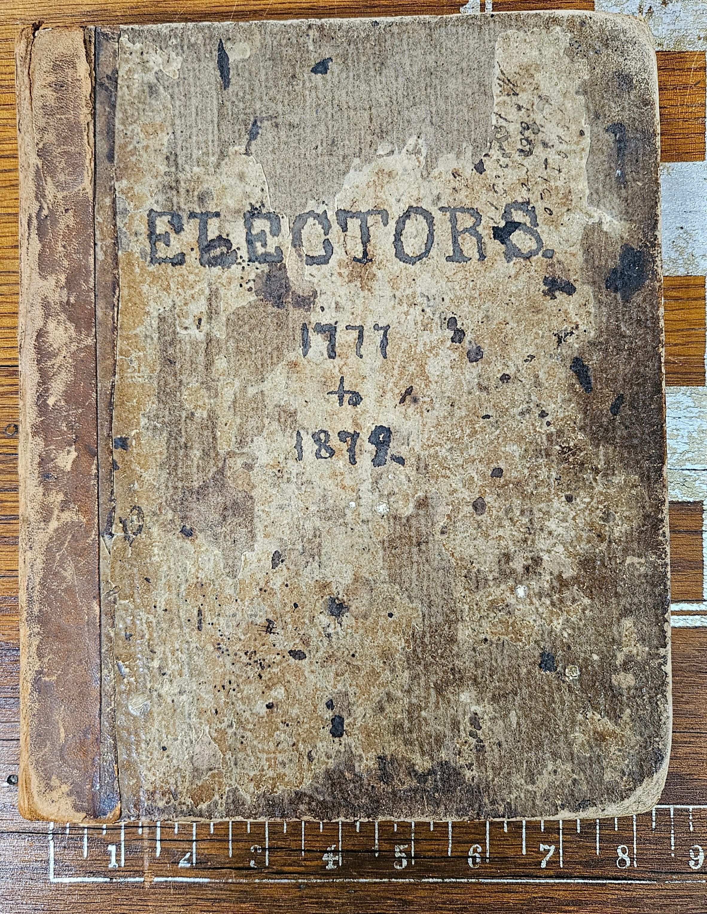 "Electors, 1777 to 1878." Records of electors of the Town of Windham, CT, 1777-1878. Includes lists of electors and minutes of electors' meetings. Handwritten on blank white pages in several different hands. Possibly kept by the Windham Town Clerk. Brown cardboard covers with leather spine.Context