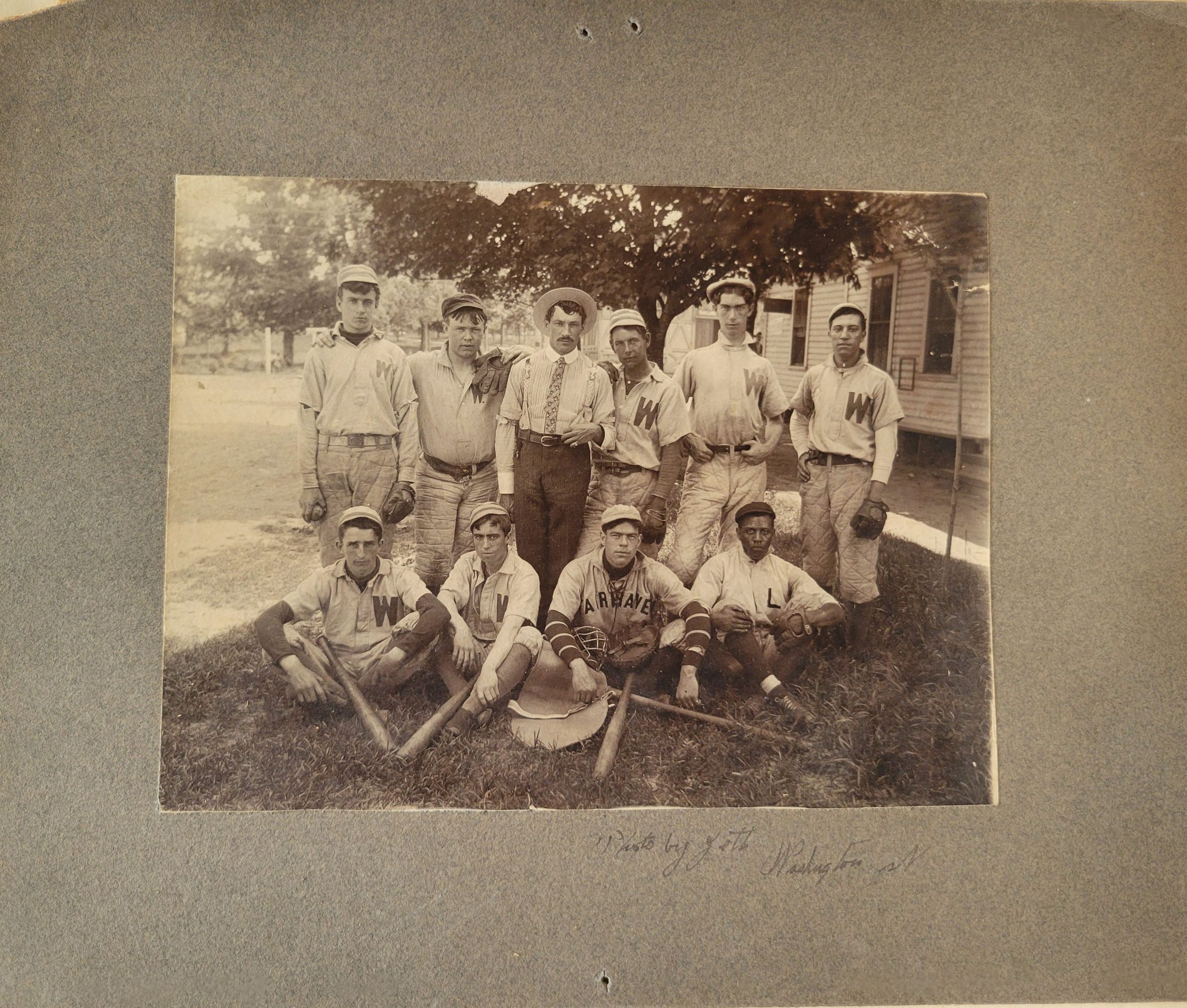 Photograph of 9 players and their coach, circa 1900. The photo is adhered to a grey mat, on which there is an inscription in pen "photo by Jett / Washington (?)" The top left corner of the mat is missing and there are three pin marks, two in the top and one in the bottom.Photograph Details