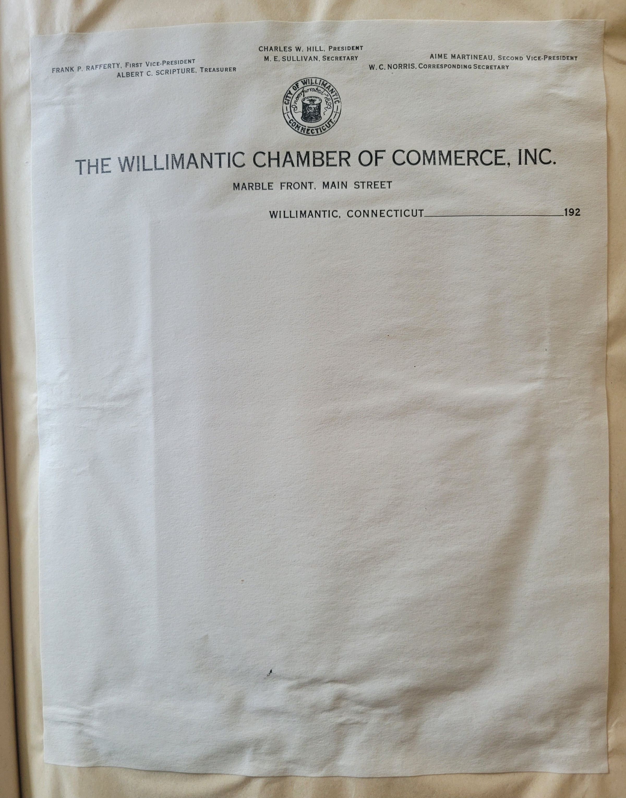 Three samples of blank letterhead from positions held by Charles W. Hill as president of the American Thread Co. Athletic Association, President of the Willimantic Chamber of Commerce, and secretary of the Rotary Club of Willimantic.Collection