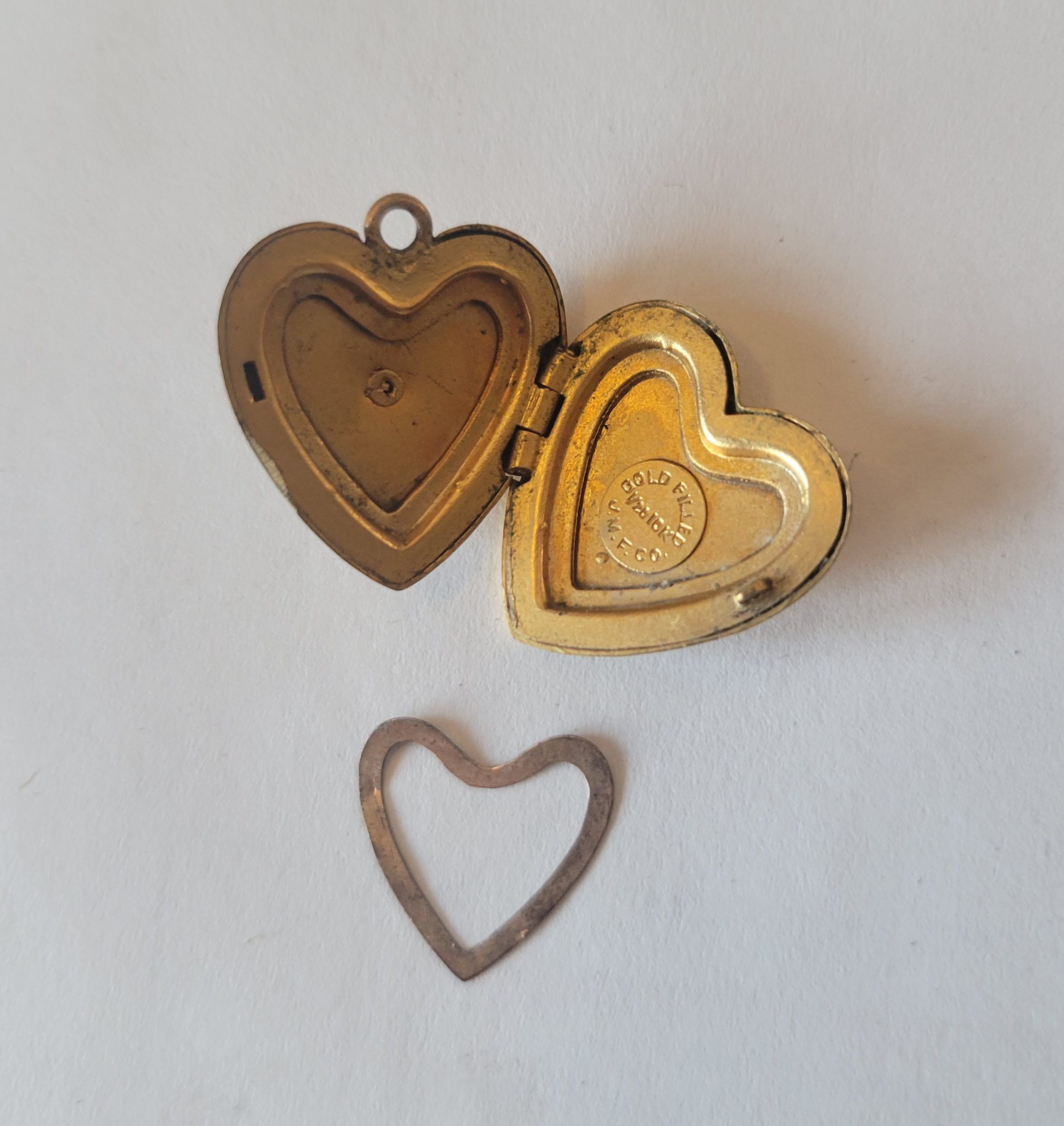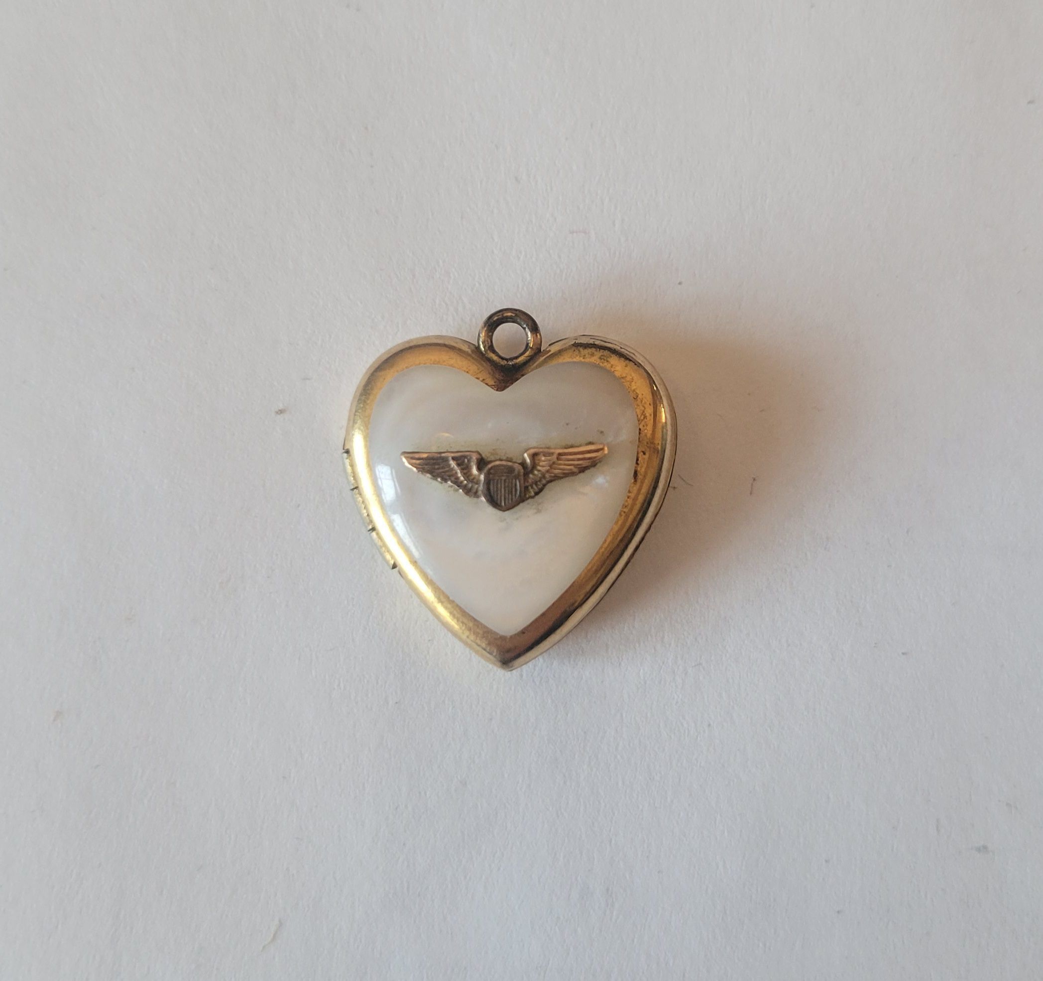 A mother of pearl and gold heart-shaped locket with the Air Force emblem on the front. Circa 1930. The locket opens to reveal two places for pictures inside. It also contains a heart-shaped template which allowed the wearer to accurately cut out the shape of a photo to place inside the locket.Collection