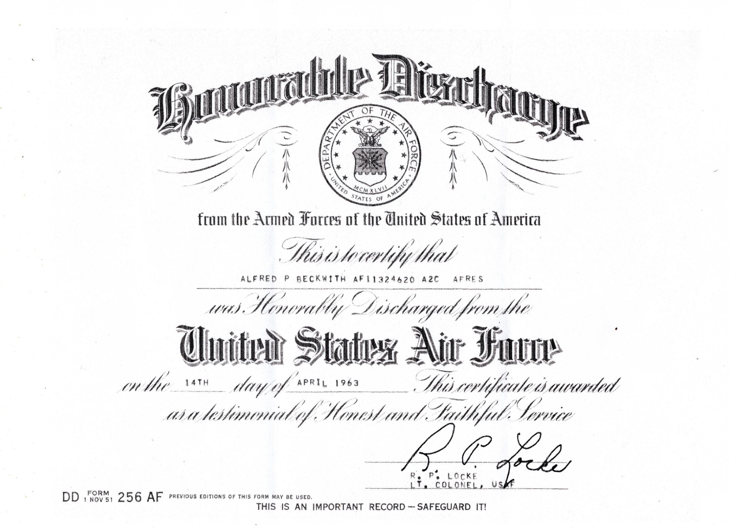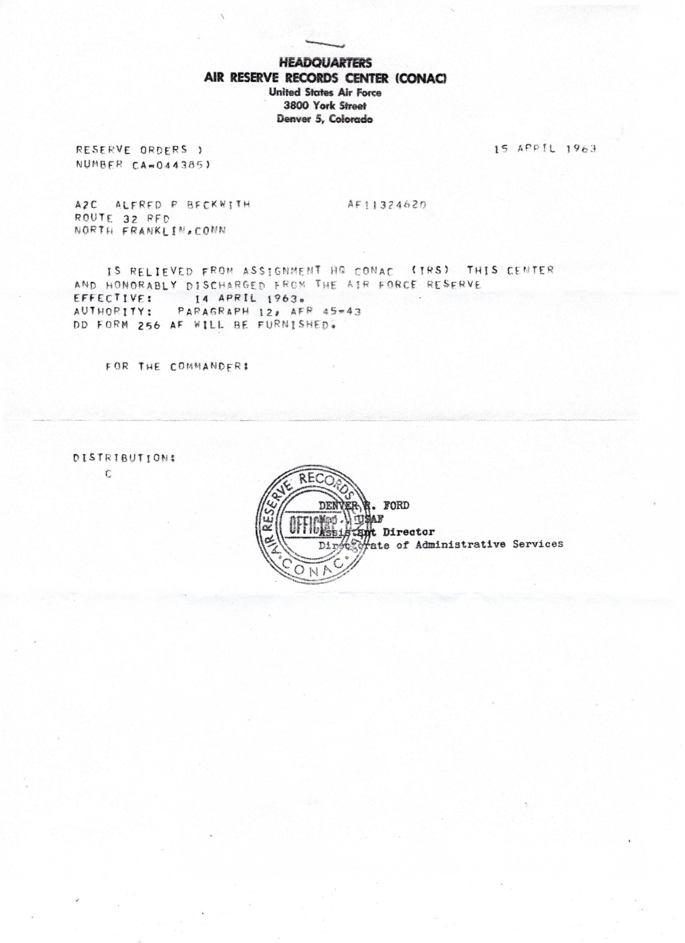 Alfred Pierce Beckwith of South Windham, CT was an active duty aircraft mechanic in the USAF from 1957 to 1961, and served two additional years in the reserves, being honorably discharged in 1963. Beckwith originally joined the Air Force alongside his cousin John "Skip" Doubleday of Lebanon CT. Before his death, Beckwith was the owner of AP-n-Son small engine repair. His grandfather was a carpenter who worked on building the Windham Town Hall.Collection