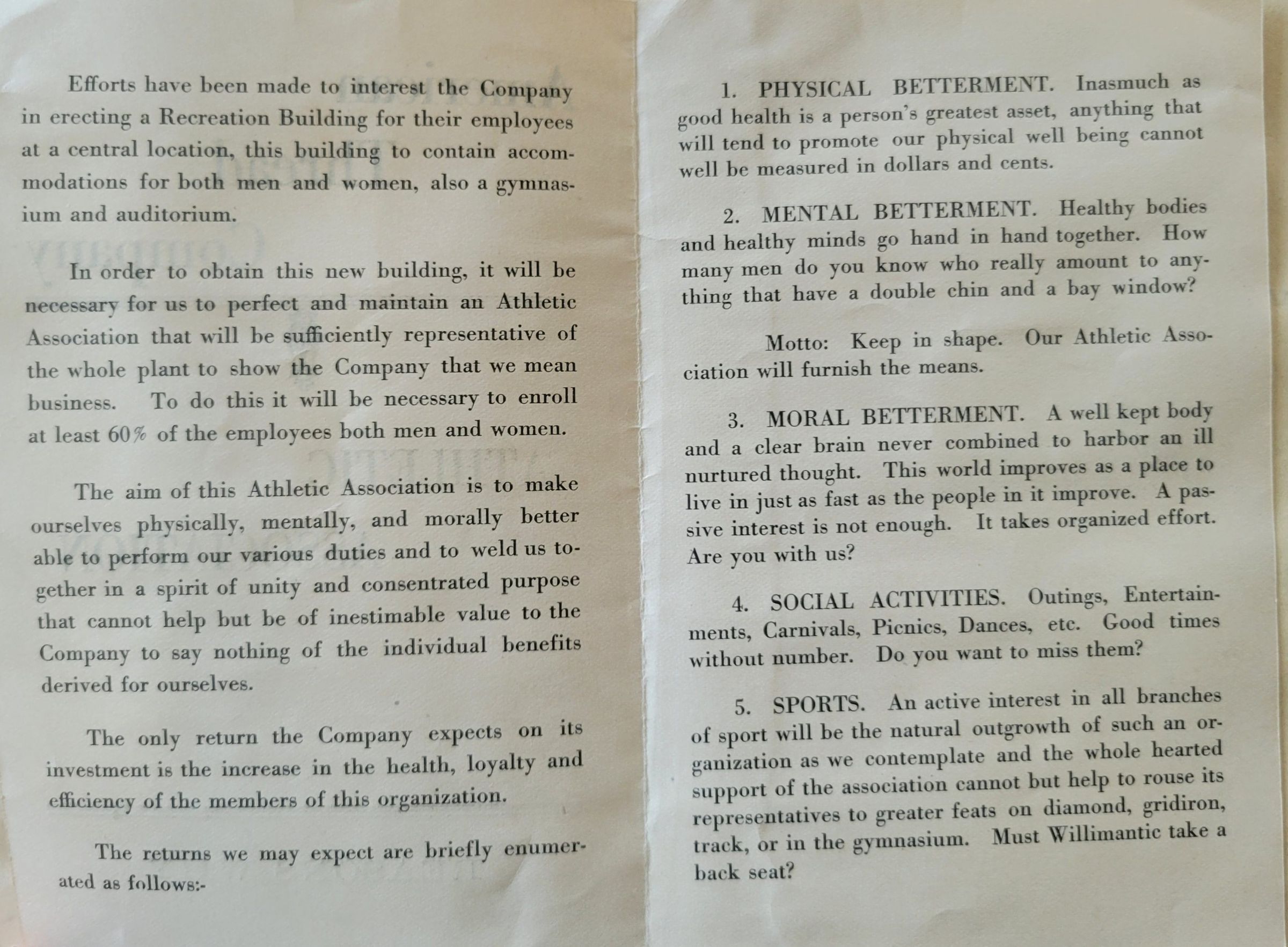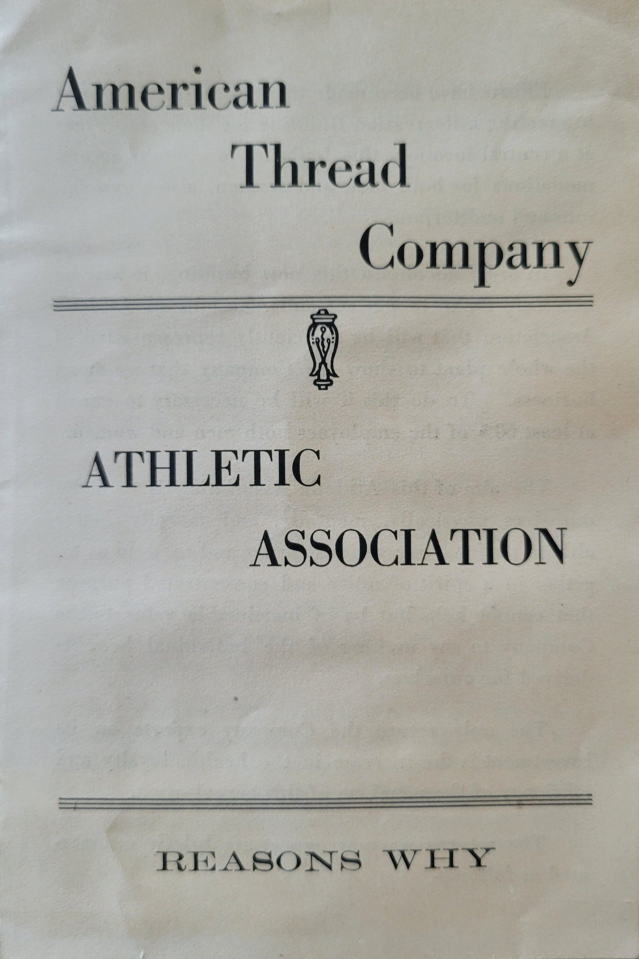 A pamphlet from the Athletics Association of the American Thread Company detailing the reasons why an employee should join the association. Charles W. Hill spearheaded the creation of the association to promote the well-being of the company's employees.Collection