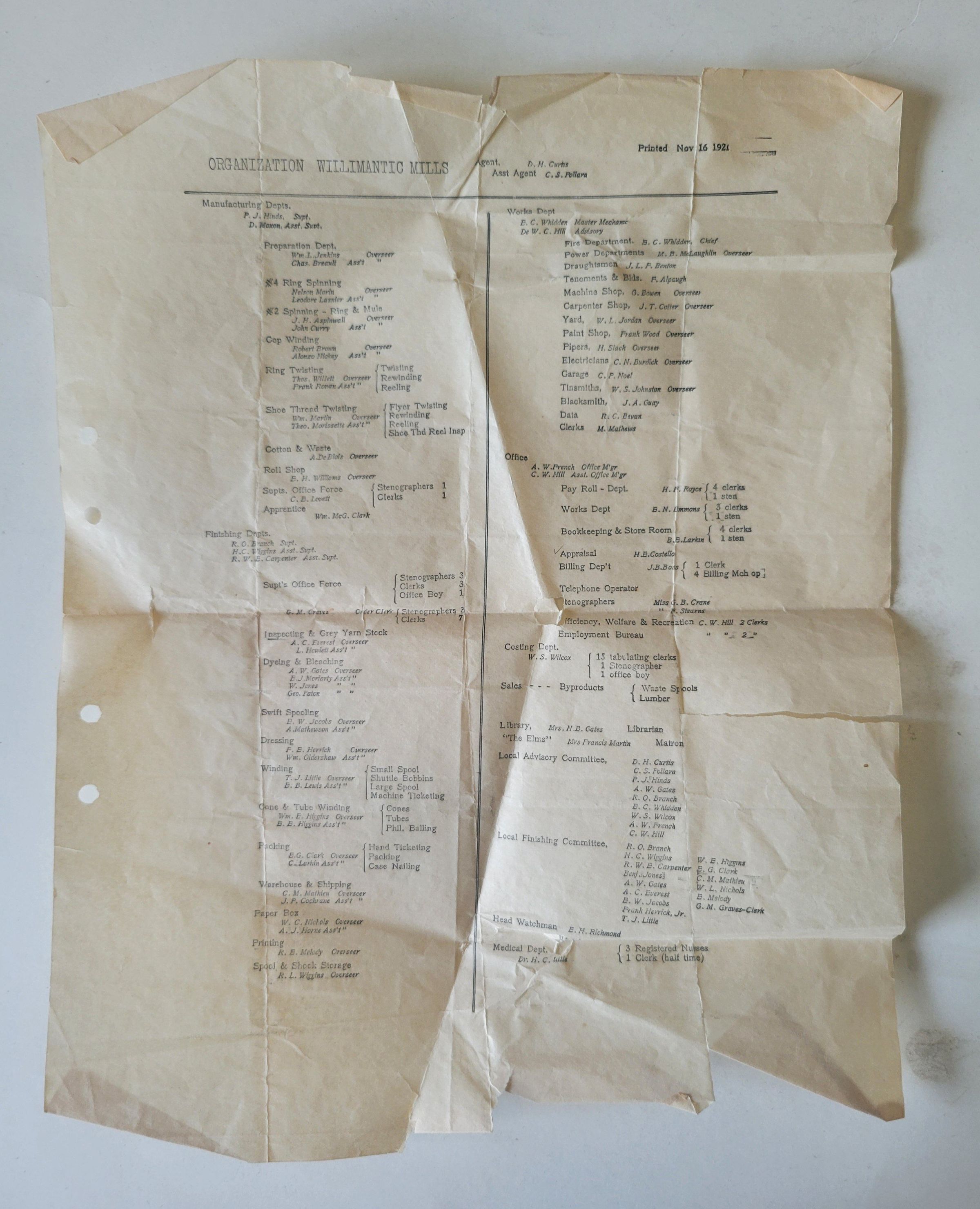 Directory for American Thread Co. Willimantic Mills, dated November 16, 1921. The directory is printed on onionskin paper, is creased in numerous places, and torn at the edges. There are four round holes on the left side.Collection