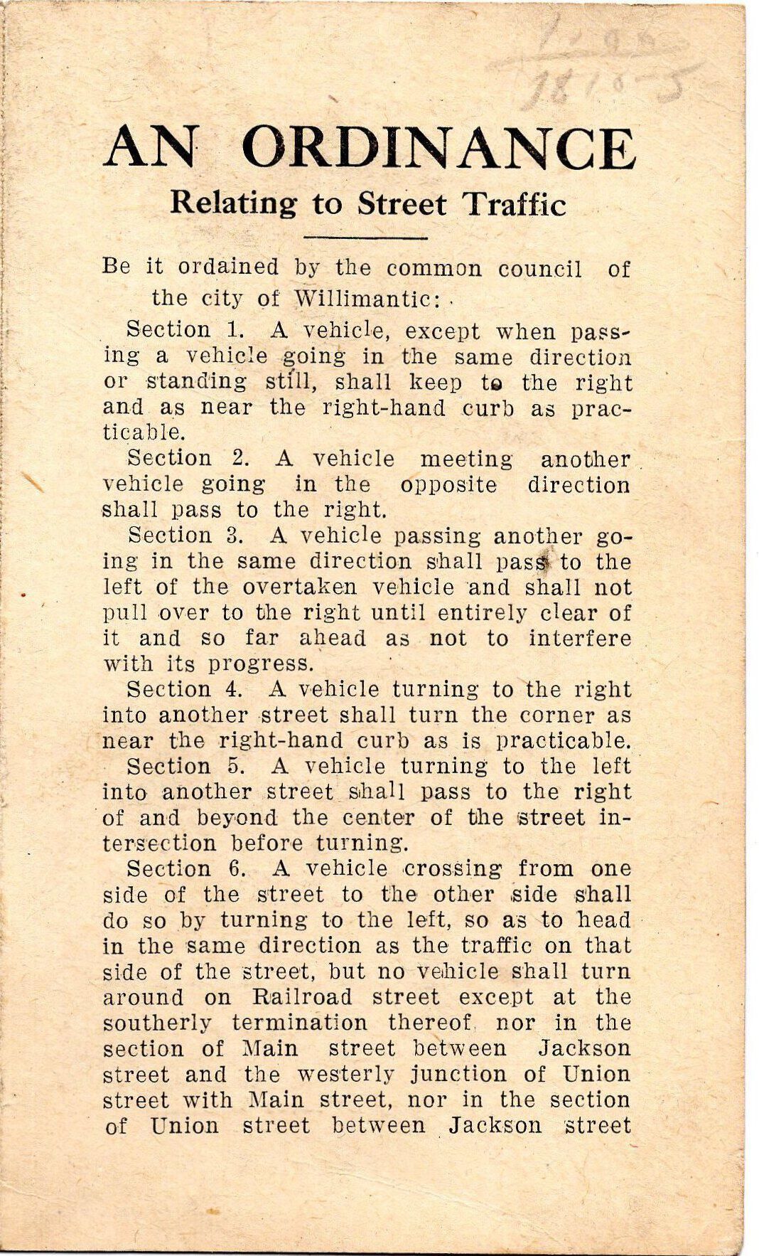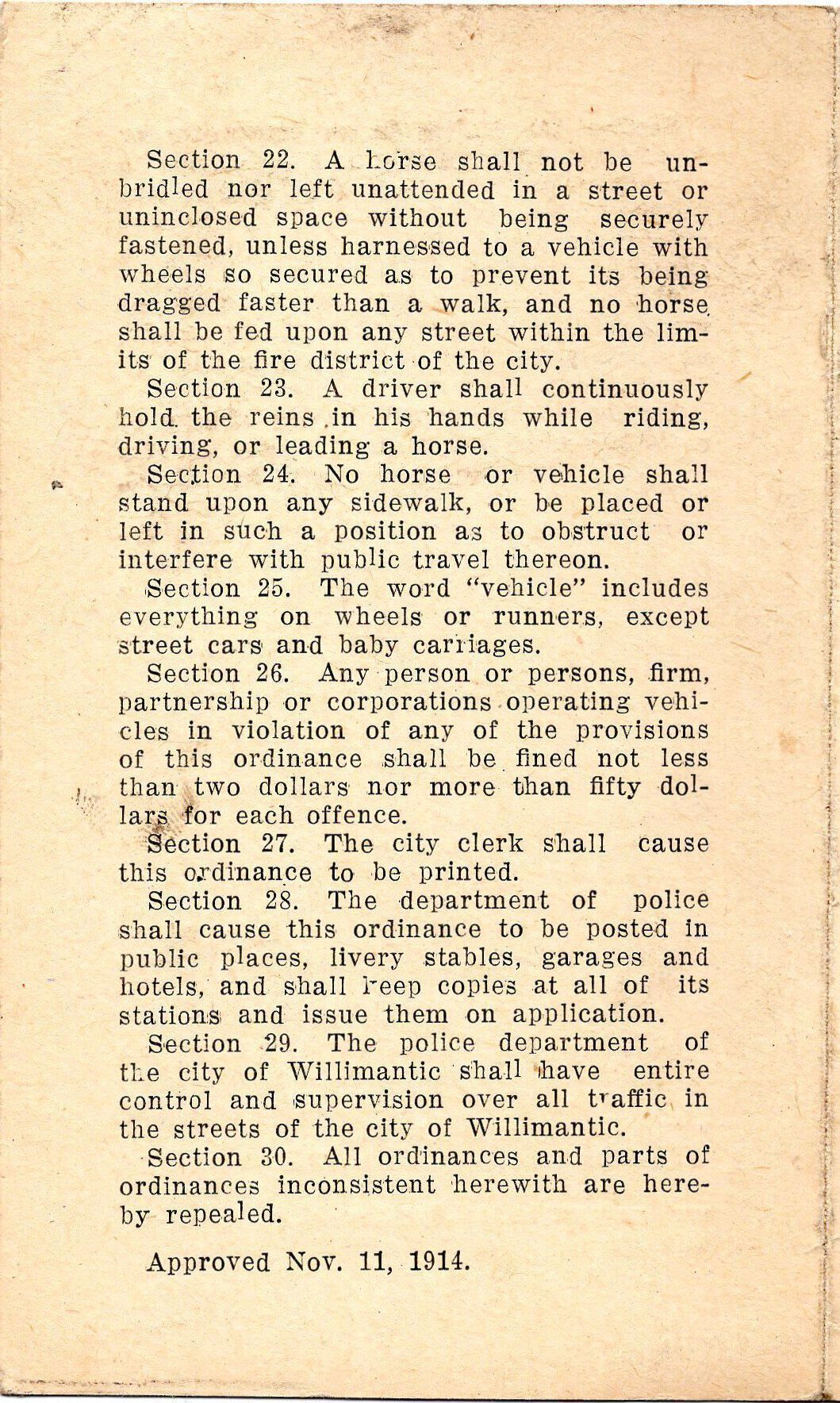 A publication related to traffic issues in Willimantic approved on November 11th, 1914.Dimensions