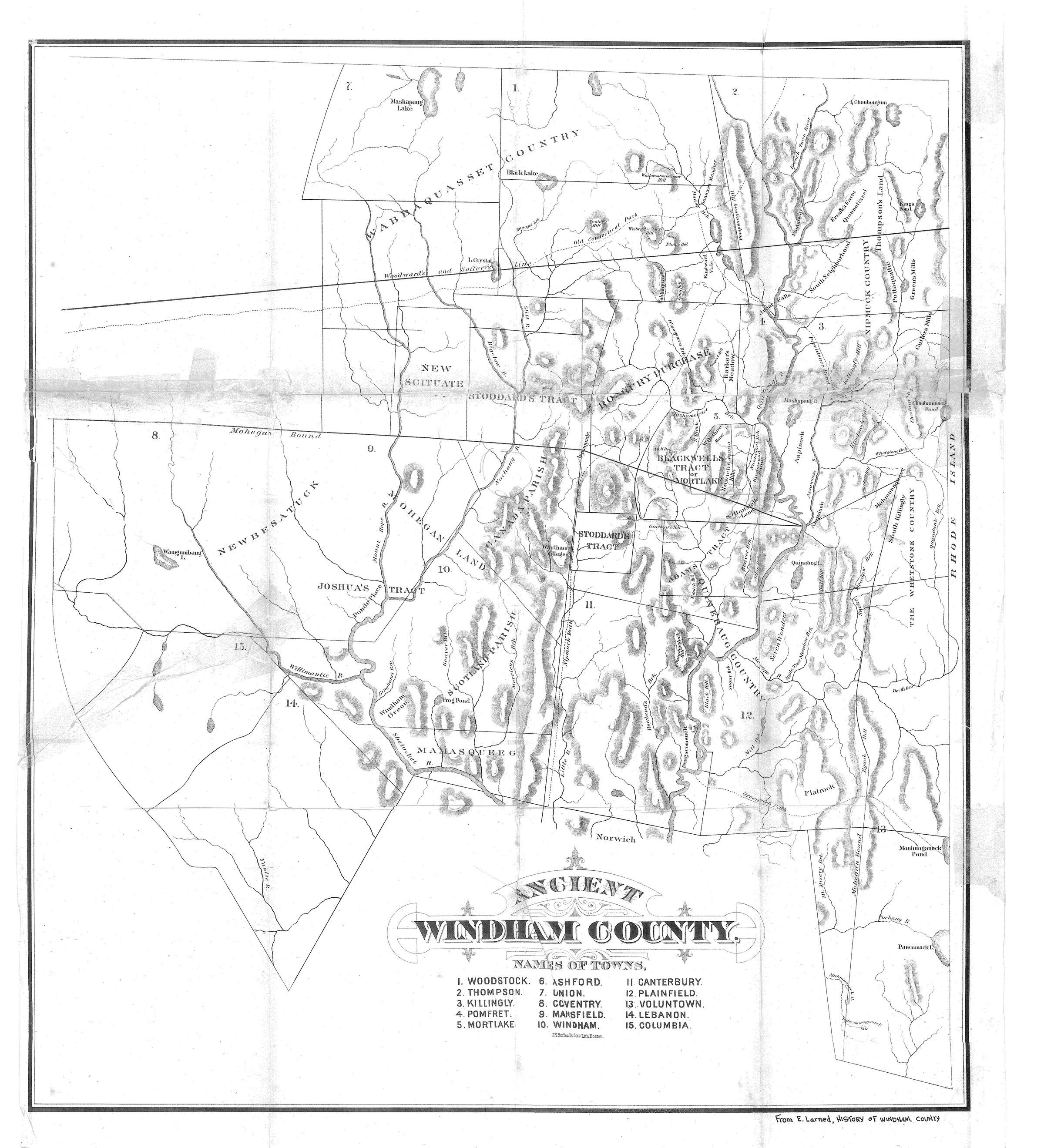 Map of "Ancient Windham County," showing the original settlements and land divisions made by European American settlers in the late 1600s, including Joshua's Tract. Fragile. Printed on thin paper and mended with tape. Printed by J. H. Bufford's Son, Lithographer, Boston, MA. This map was a fold-out that accompanied Ellen Larned, HISTORY OF WINDHAM COUNTY, vol. I (1874)Collection