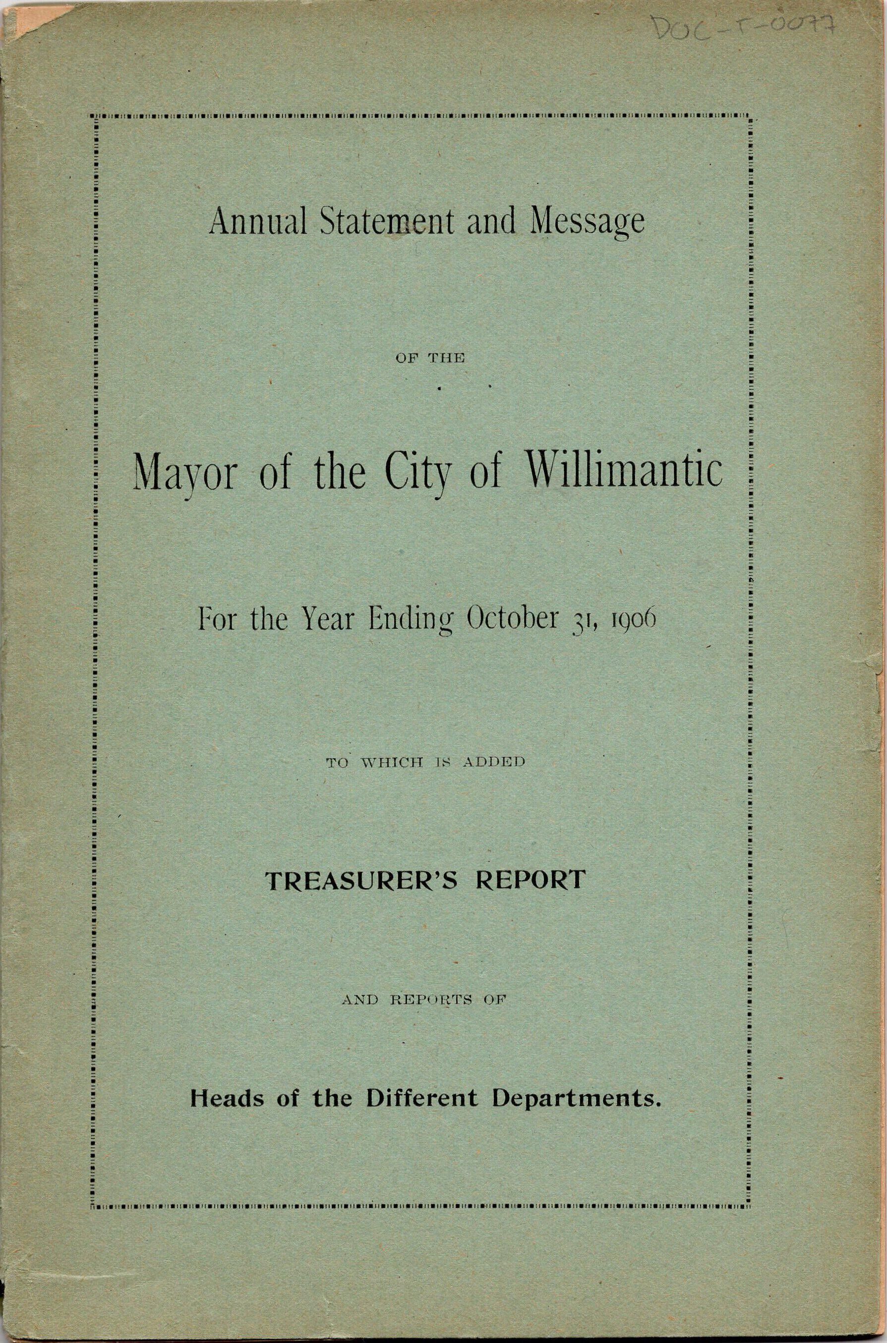 Annual Statement and Message of the Mayor of the City of Willimantic, October 1906Entry/Object ID