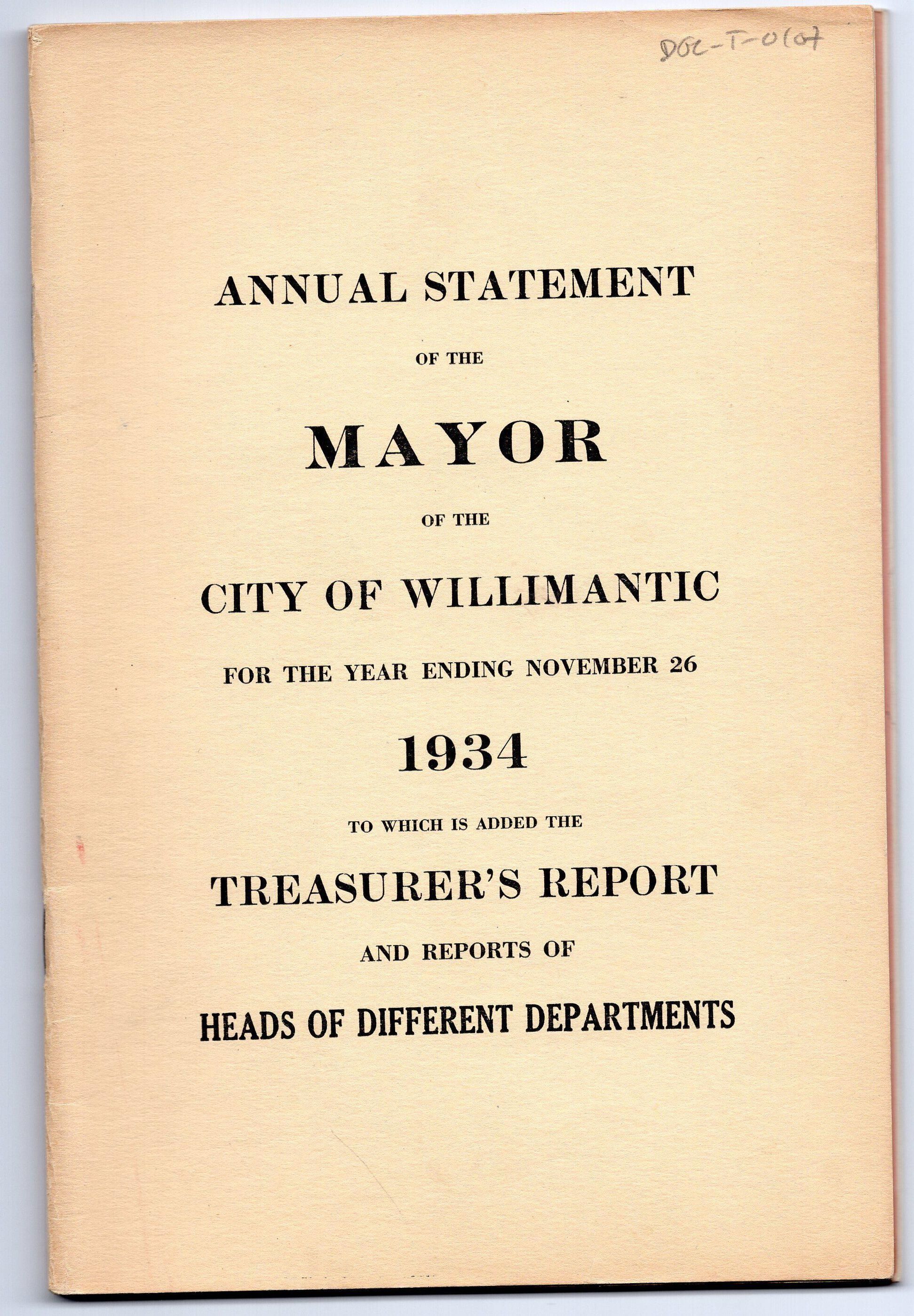 Annual Statement of the Mayor of the City of Willimantic, November 1934.Entry/Object ID