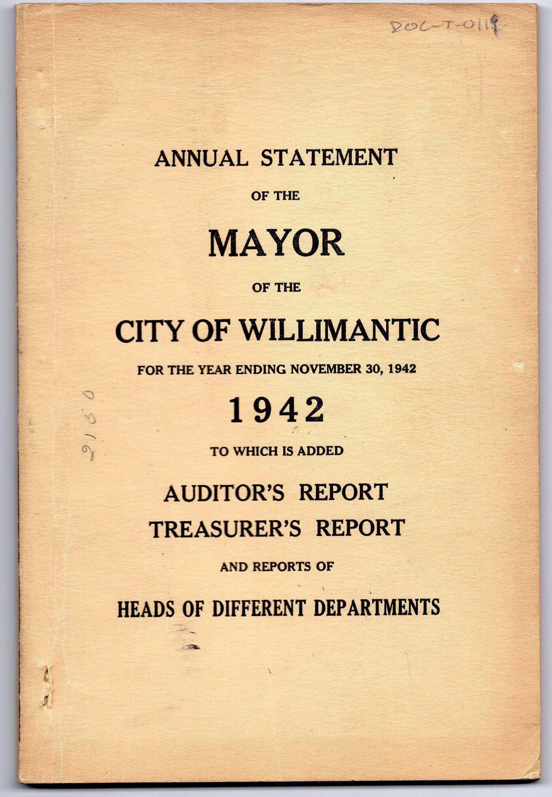 Tan cover. The annual statement of the mayor, Russell W. Hinman, of Willimantic in 1942. Reports from the auditor, treasurer, and heads of departments for the year ending on November 30, 1942.Created By