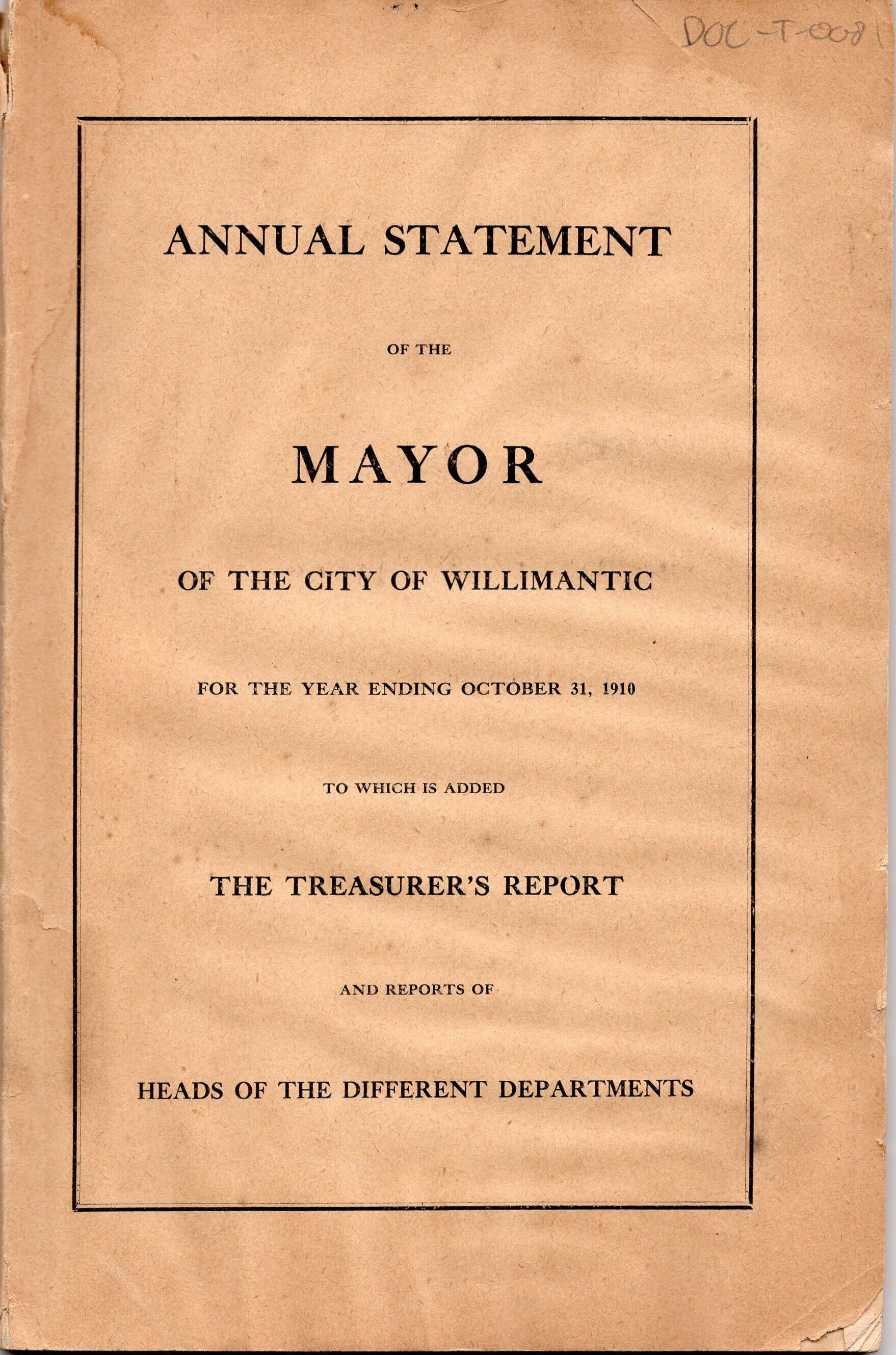 Annual Statement of the Mayor of the City of Willimantic, October 1910Entry/Object ID