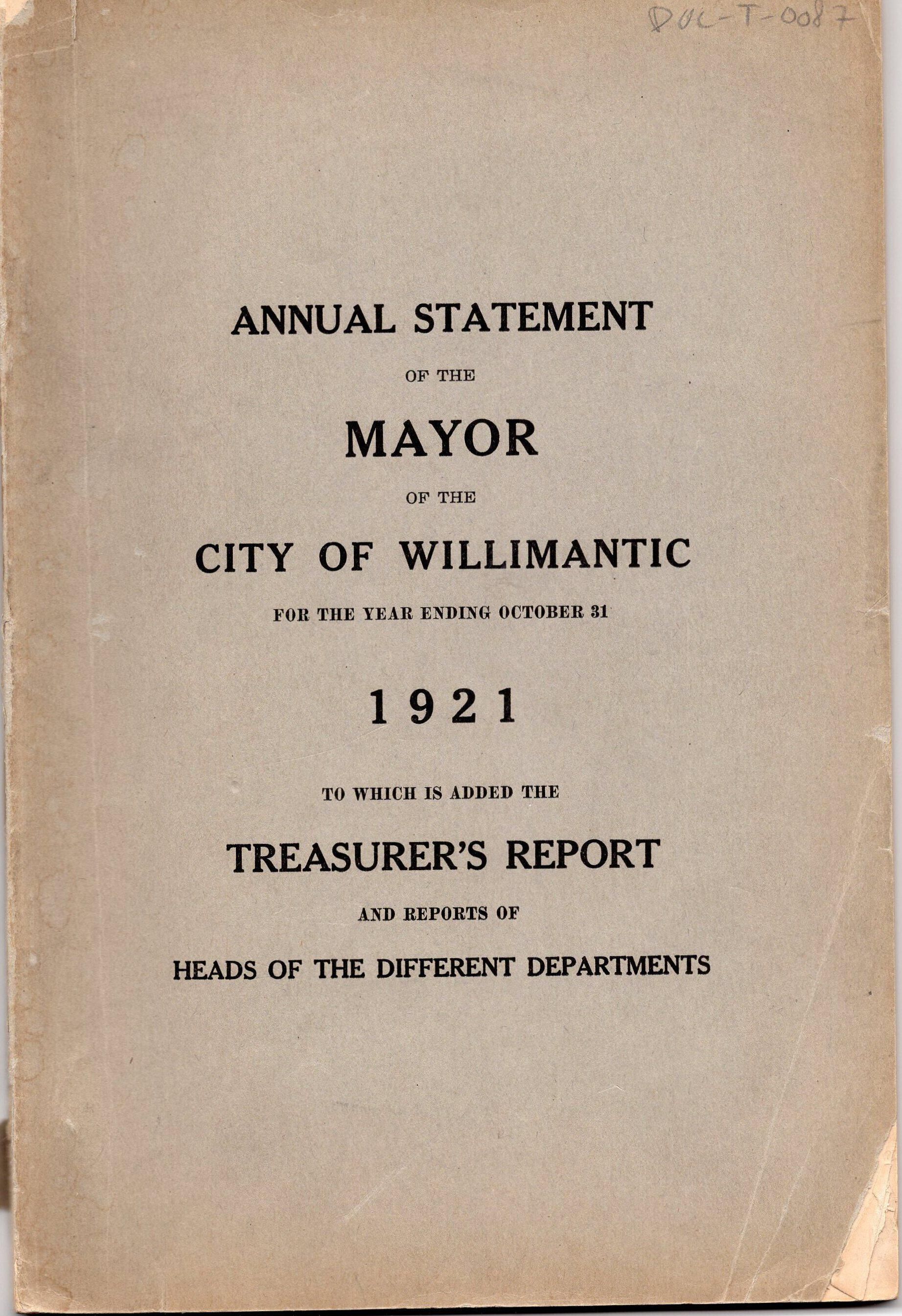 Annual Statement of the Mayor of the City of Willimantic, October 1921Entry/Object ID