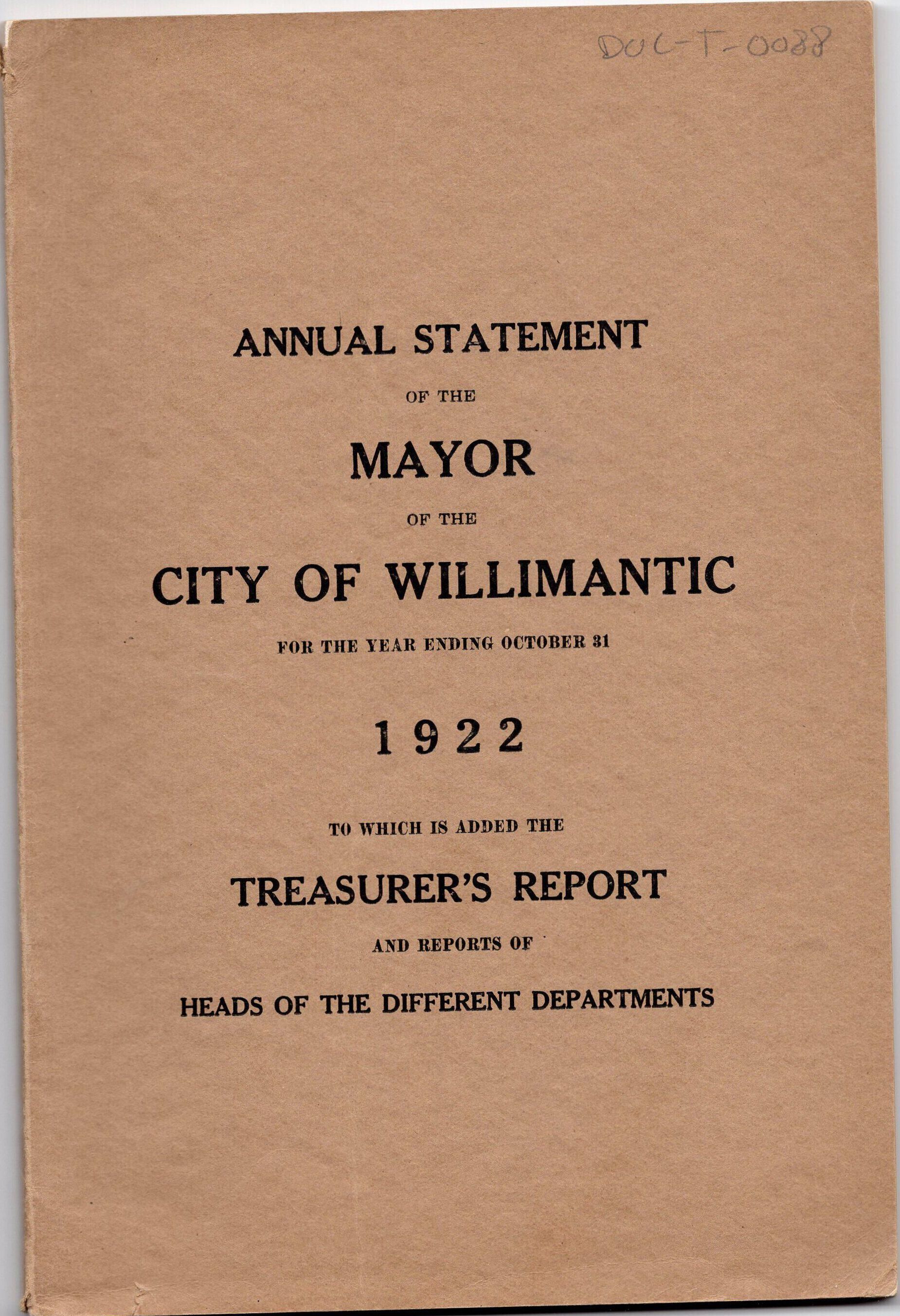 Annual Statement of the Mayor of the City of Willimantic, October 1922Entry/Object ID