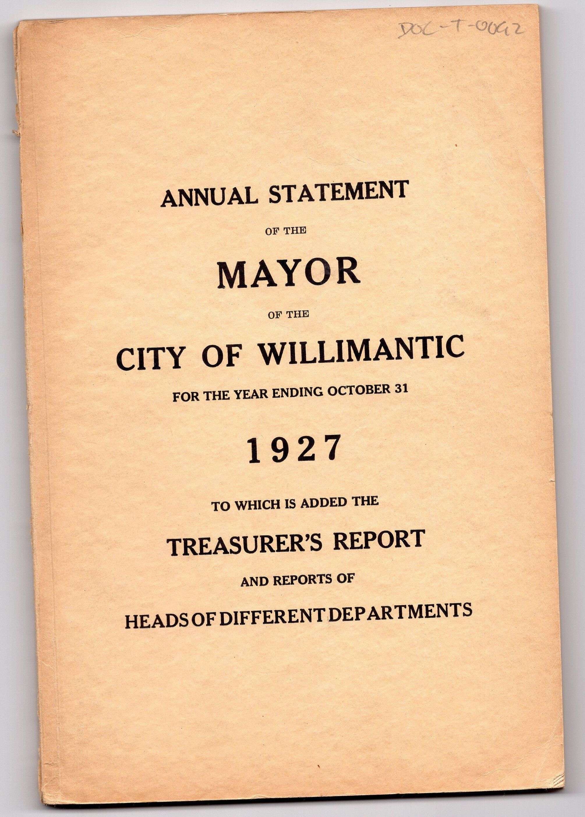 Tan cover of the annual statement of the mayor, John C. Tracy, of Willimantic in 1927. Reports from the treasurer and heads of departments for the year ending on October 31, 1927.Condition