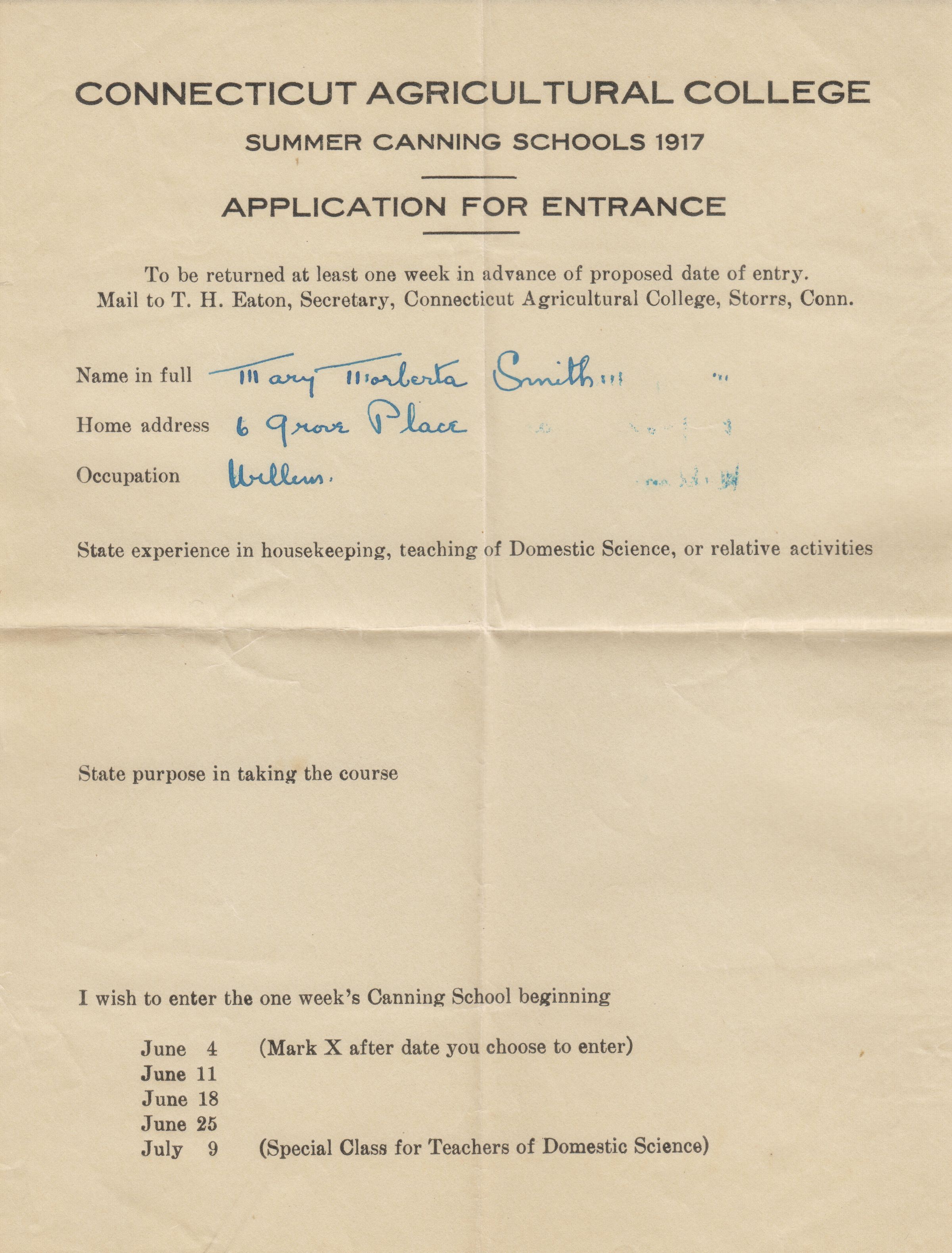 Application for entrance to Connecticut Agricultural College's Summer Canning Schools. 1917. Application begun by Mary Norberta Smith, 9 Grove Place, Windham, CT. Application is incomplete and probably was never submitted.Collection