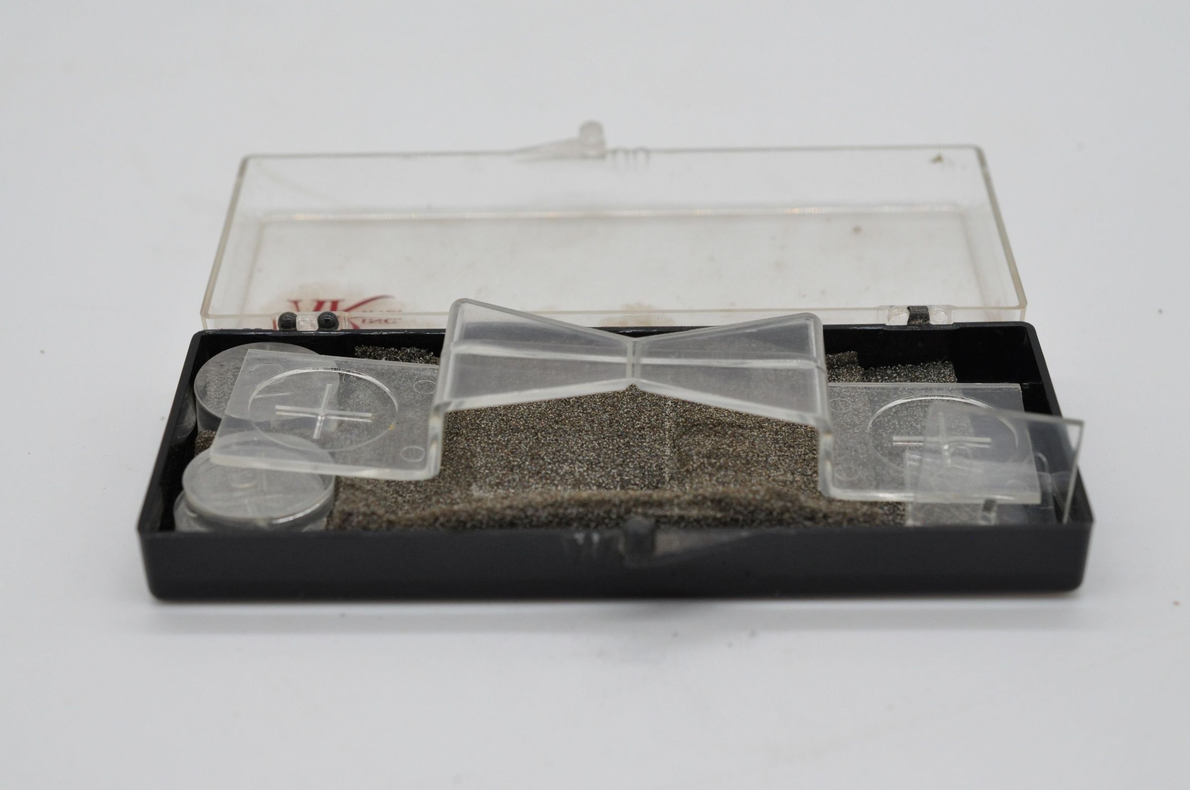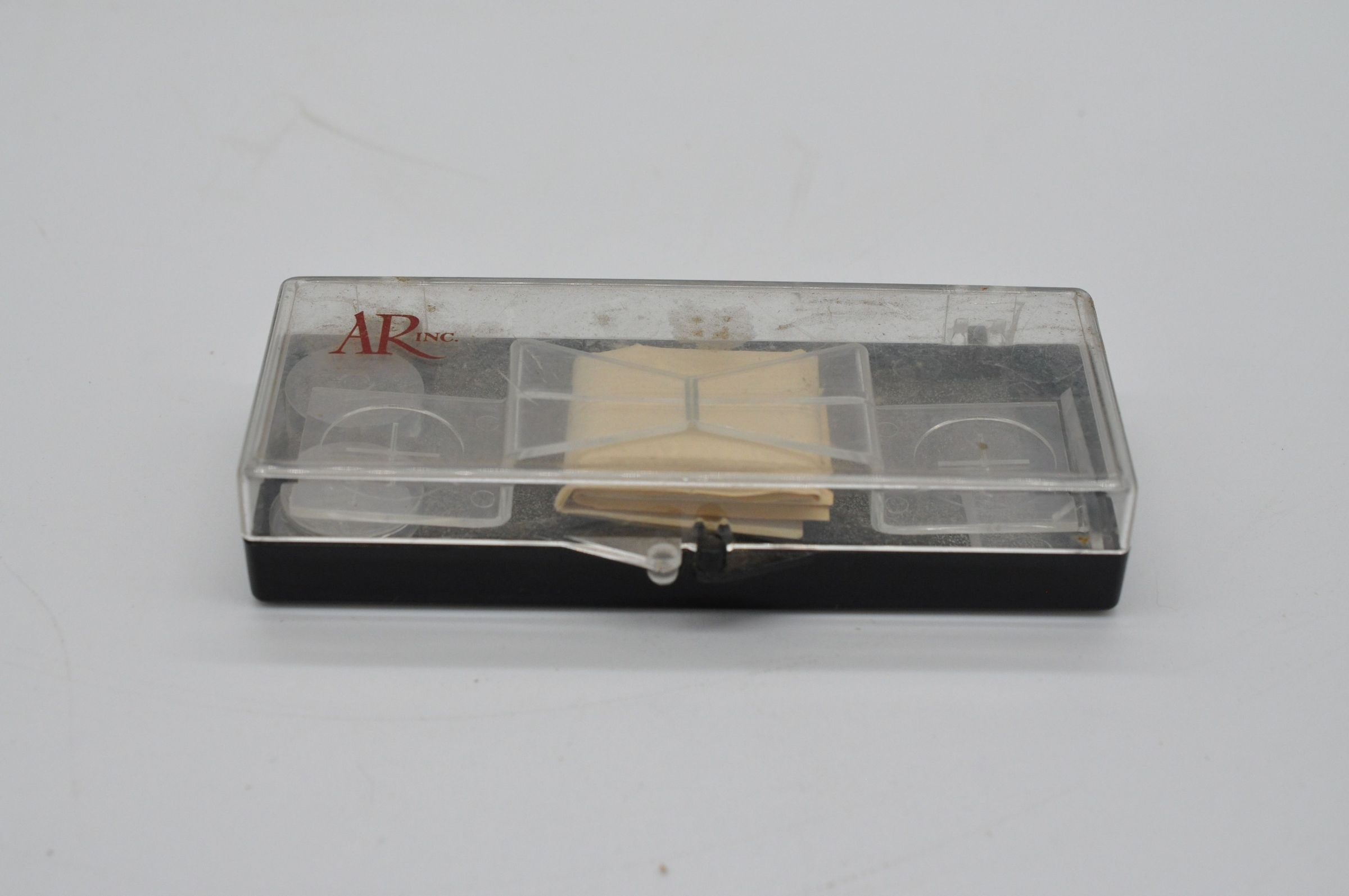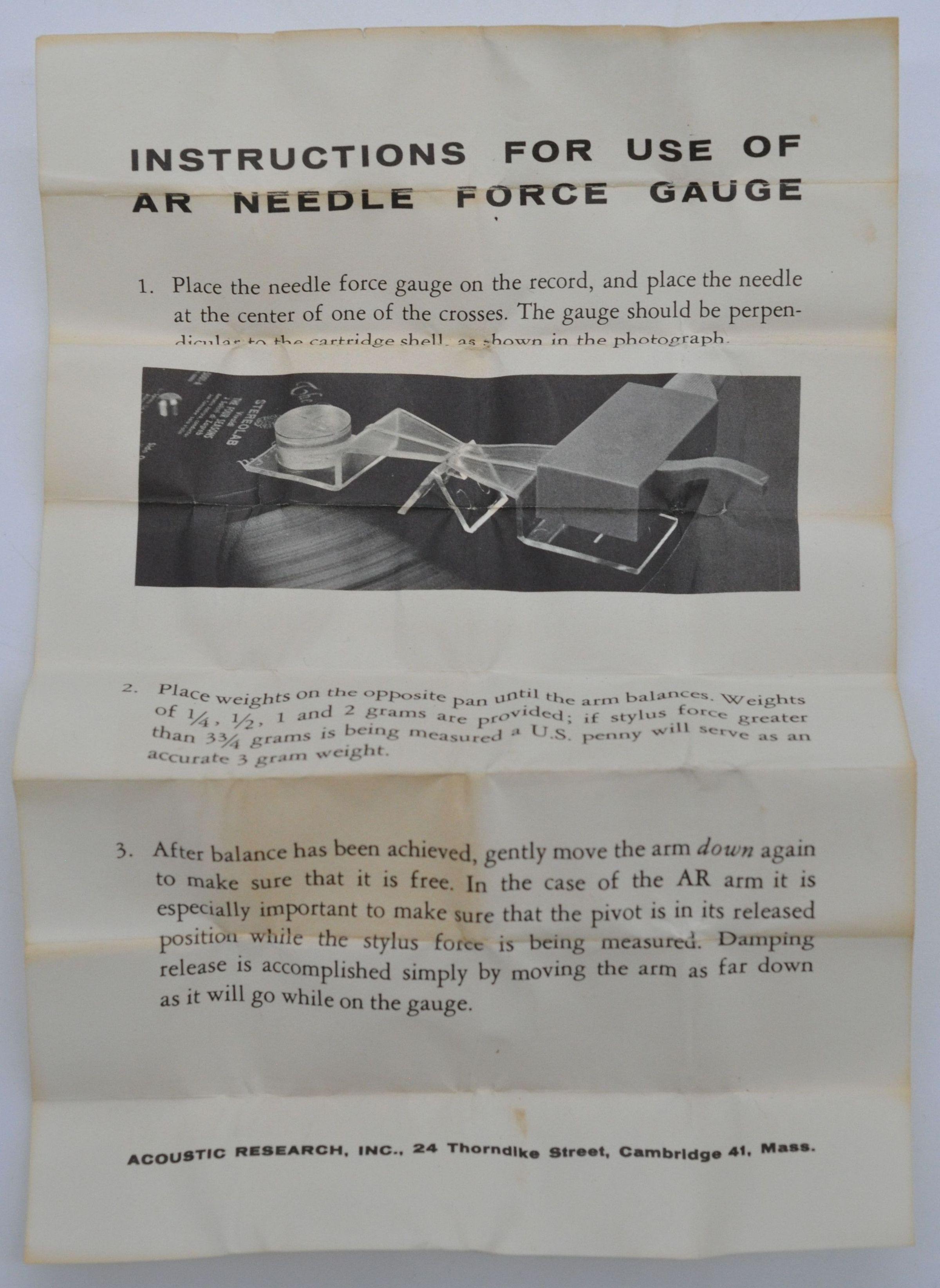 Acoustic Research (AR) needle force gauge for turntables. This gauge is used to determine the force of the tonearm of a turntable by balancing it against small weights. The kit includes a clear plastic lever and fulcrum, a set of small plastic weights, and instructions for use.Collection