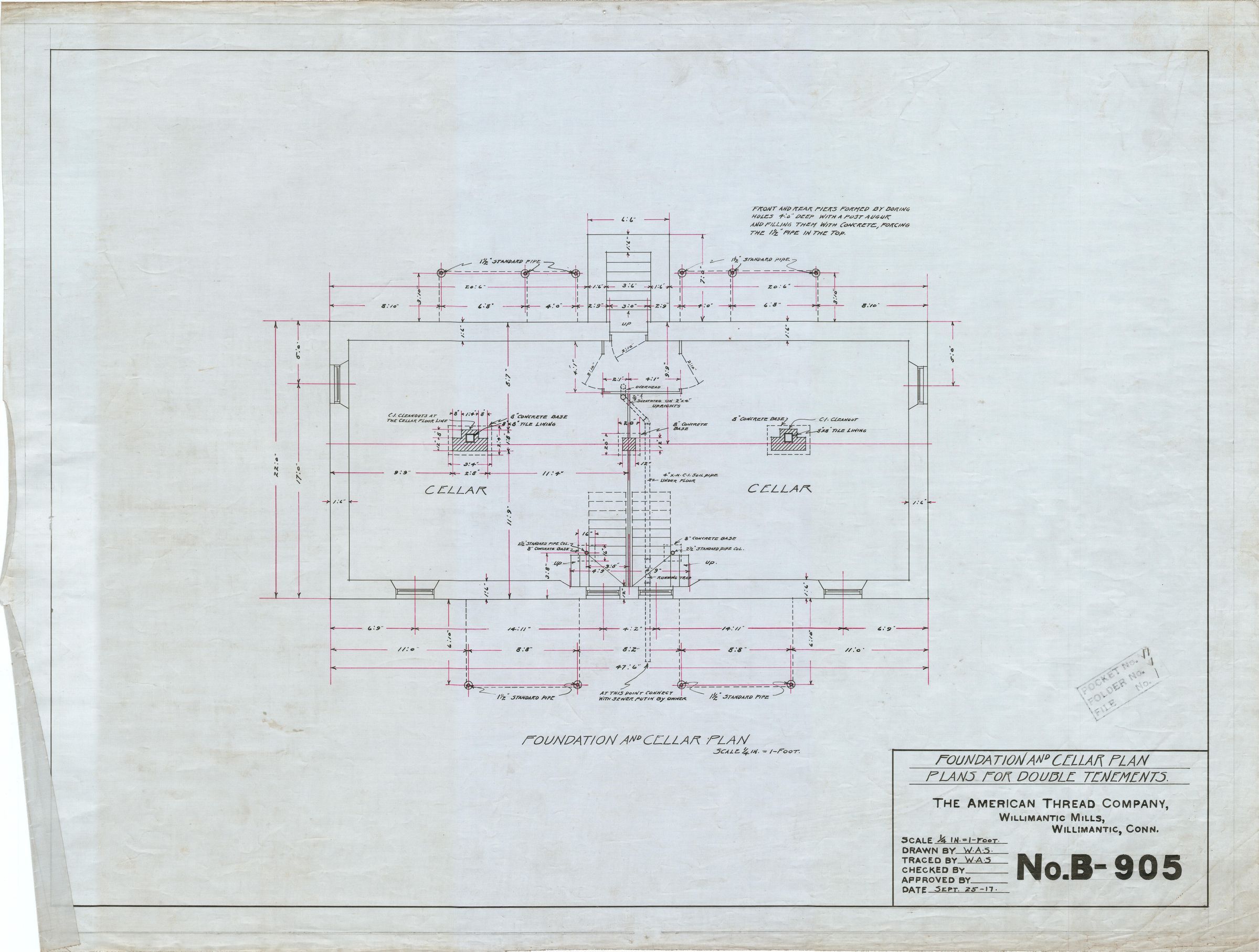 Architectural plan of worker row house, foundation and cellar plan for double tenement. American Thread Company, Willimantic Mills, Willimantic, CT.Collection