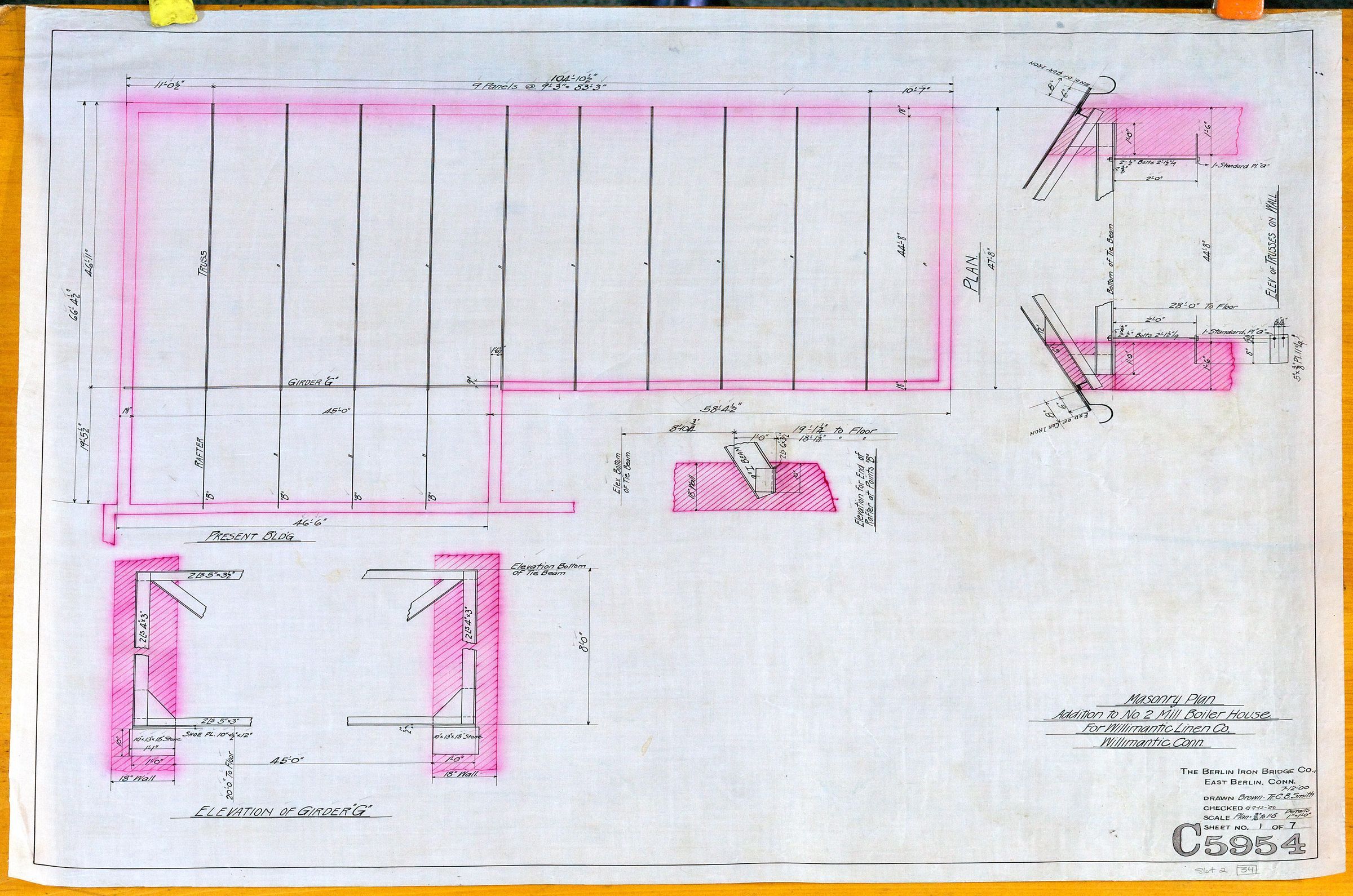 Architectural plan of addition to the No. 2 Boiler House, Willimantic Linen Company, Willimantic, CT. Masonry plan. Sheet 1 of 7. The plans were prepared by the Berlin Iron Bridge Company in 1900. By 1900 the Willimantic Linen Company had been acquired by the American Thread Company (in 1898), although the plans are labeled as having been done for the WLC.Collection
