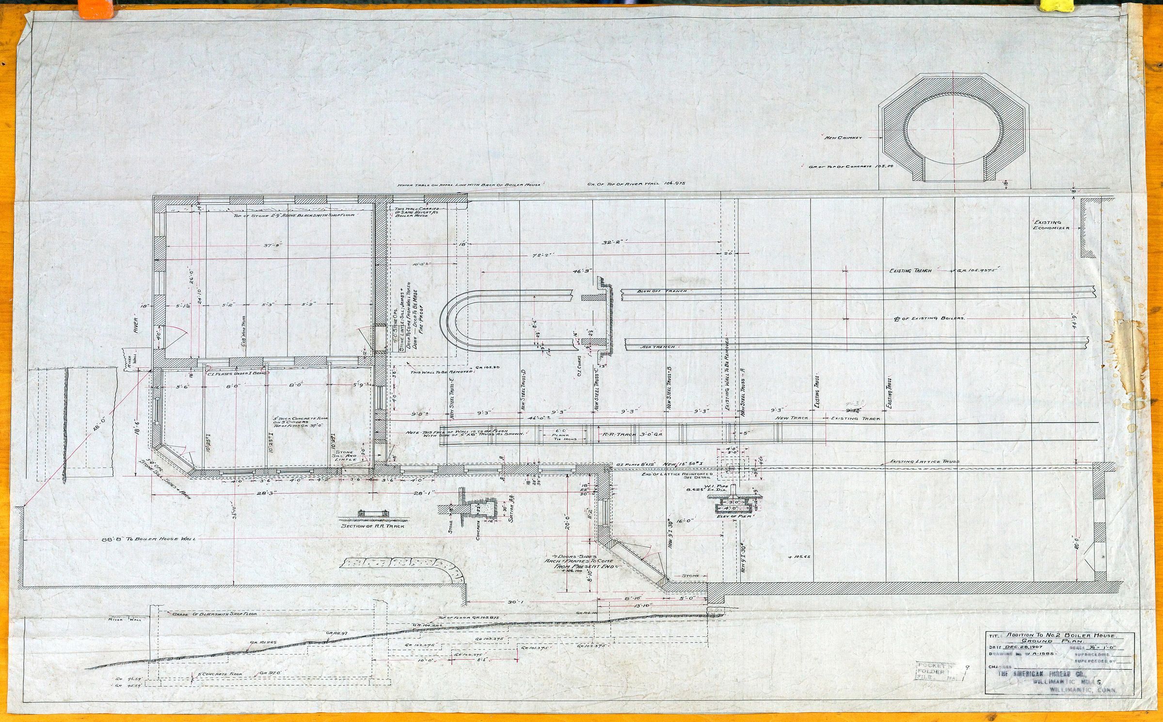 Architectural plan of addition to No. 2 Boiler House, American Thread Company, Willimantic Mills, Willimantic, CT. Ground plan. Scale: 1/4 in. = 1 ft. Digital photo made for the Mill Museum by Harrison Judd.Collection