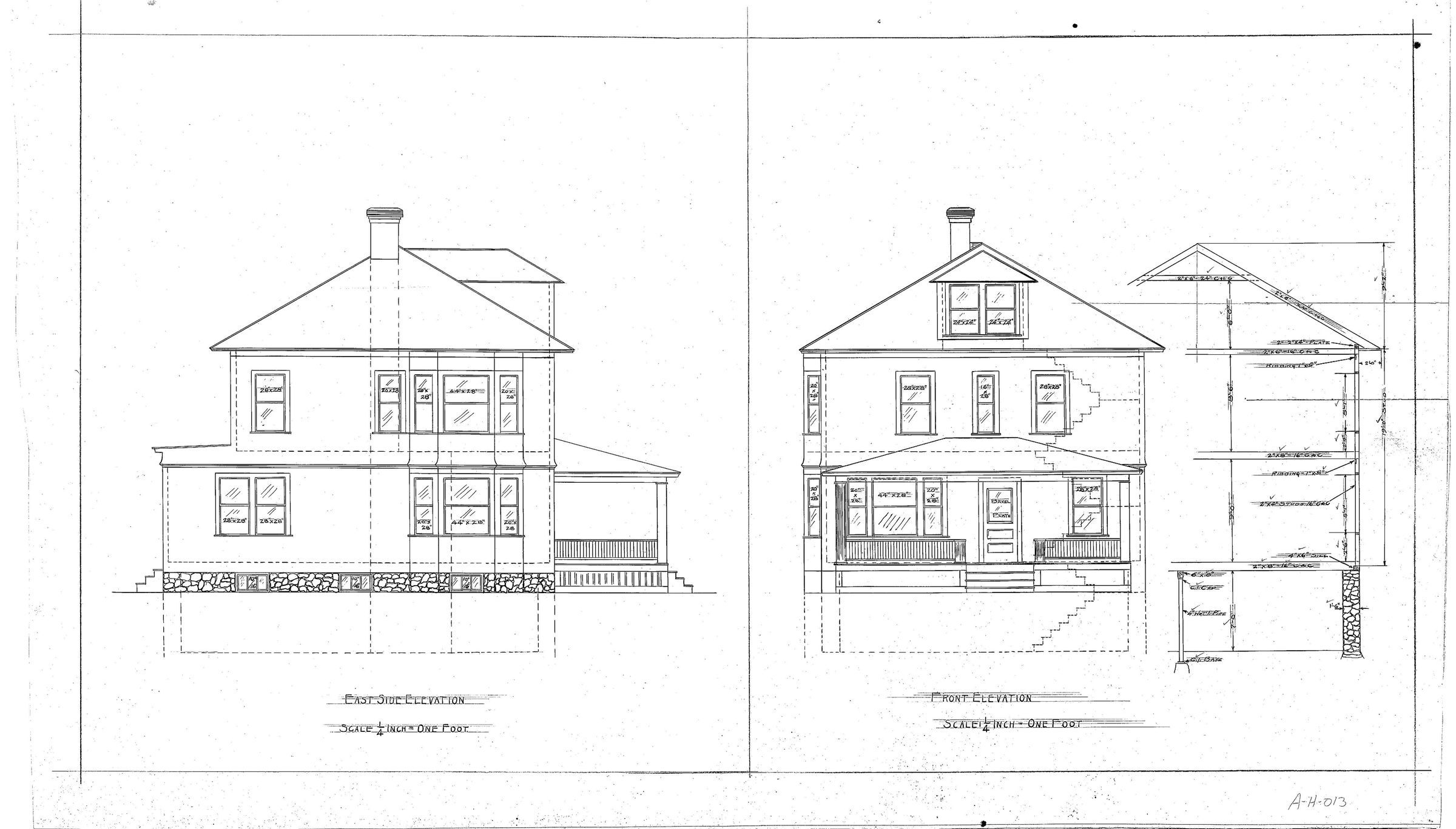 East side elevation and front elevation of what appears to be a single family house. Two stories, attic, basement. Found among architectural plans of company housing, American Thread Company, Willimantic Mills, Willimantic, CT. Scale: 1/4 in. = 1 ft.Collection