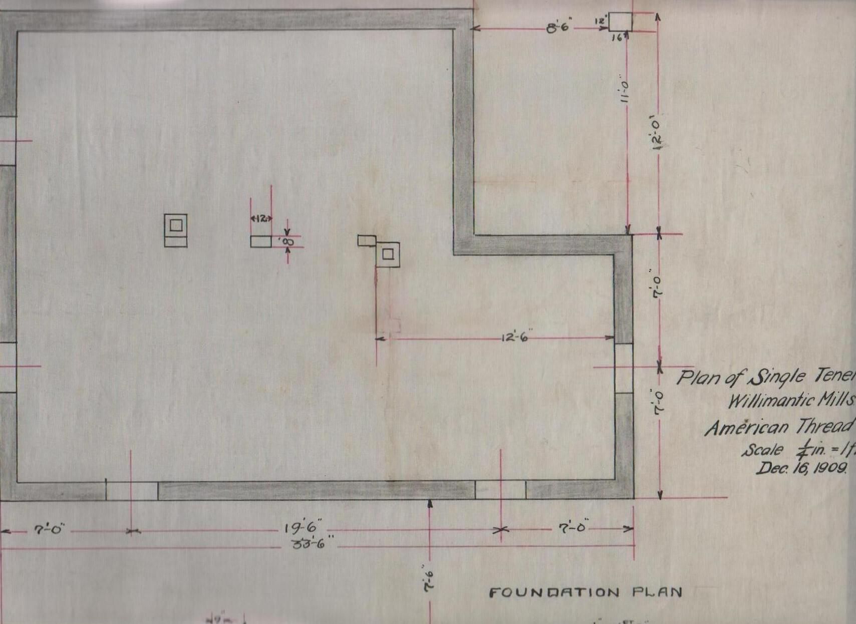 Plan of single tenement, Willimantic Mills, American Thread Company, Willimantic, CT. Scale: 1/4 in. = 1 ft. Foundation plan.Collection