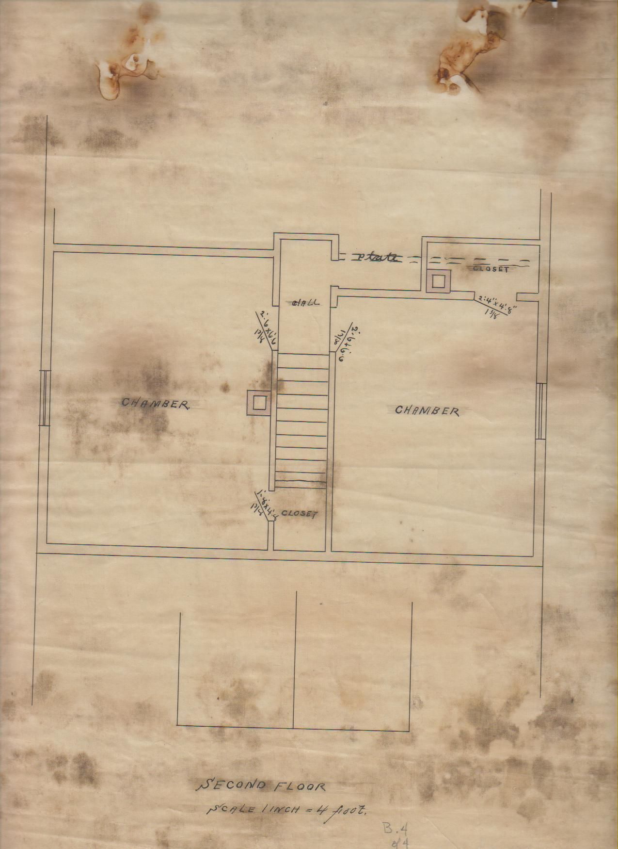 Architectural drawing of cottage (design B-4) in the Oaks, a neighborhood of single-family worker cottages built by the Willimantic Linen Company, the predecessor of the American Thread Company, Willimantic, CT. Second floor. Scale: 1/4 in. = 1 ft. Designed by noted American (Massachusetts) architect Eugene C. Gardner, among his earliest works.Collection