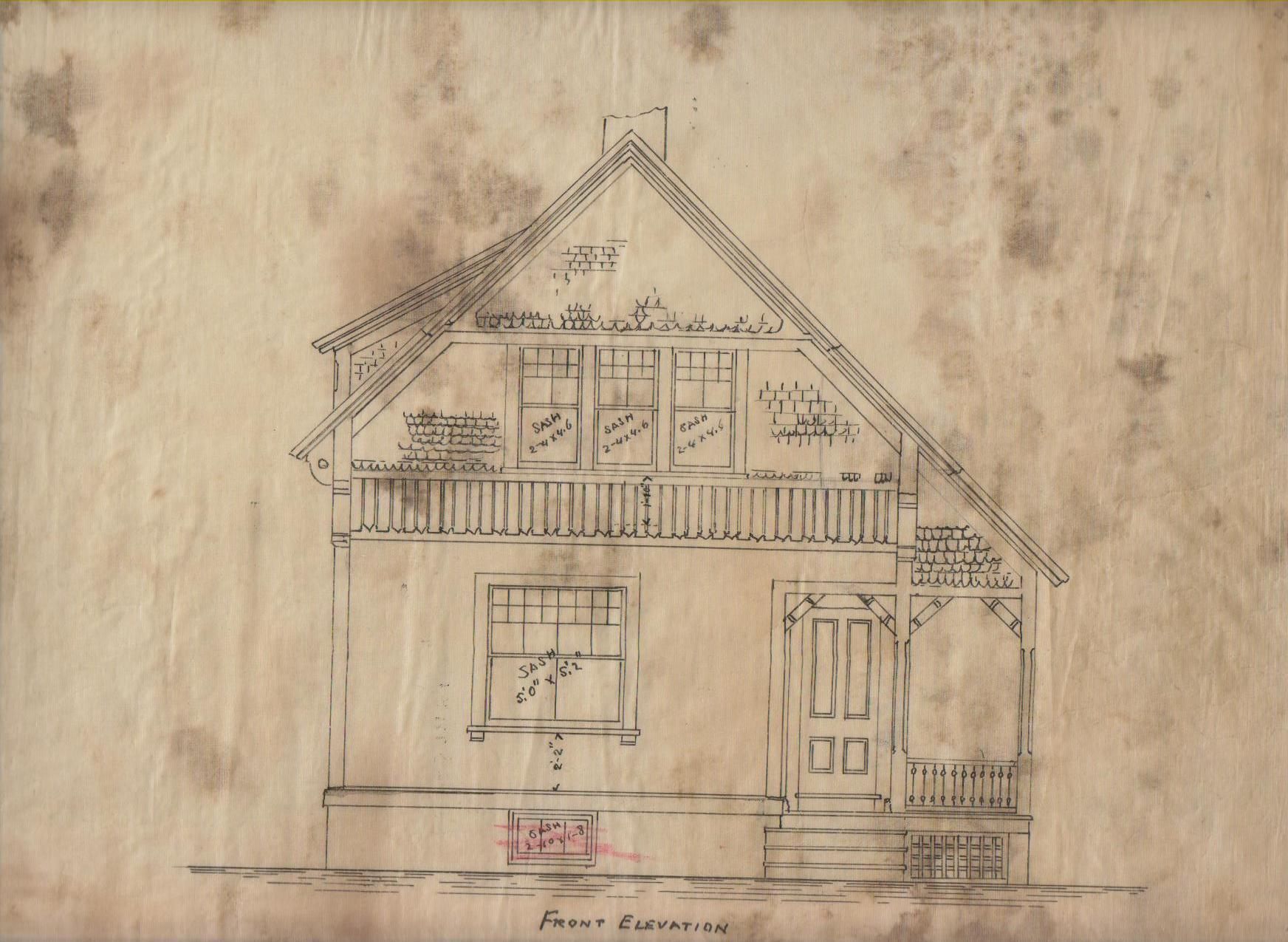 Architectural drawing of cottage (design C-1) in the Oaks, a neighborhood of single-family worker cottages built by the Willimantic Linen Company, the predecessor of the American Thread Company, Willimantic, CT. Front elevation. Scale: 1/4 in. = 1 ft. Designed by noted American (Massachusetts) architect Eugene C. Gardner, among his earliest works.Collection