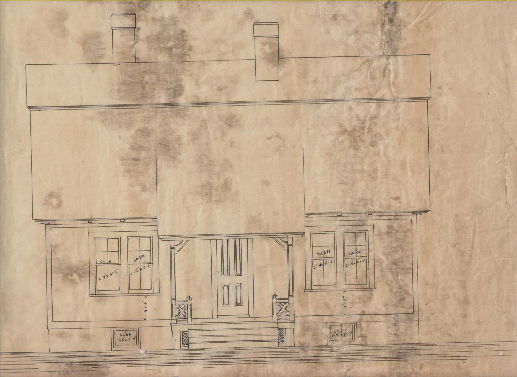 Architectural drawing of cottage (design D-1) in the Oaks, a neighborhood of single-family worker cottages built by the Willimantic Linen Company, the predecessor of the American Thread Company, Willimantic, CT. Front elevation. Scale: 1/4 in. = 1 ft. Designed by noted American (Massachusetts) architect Eugene C. Gardner, among his earliest works.Collection