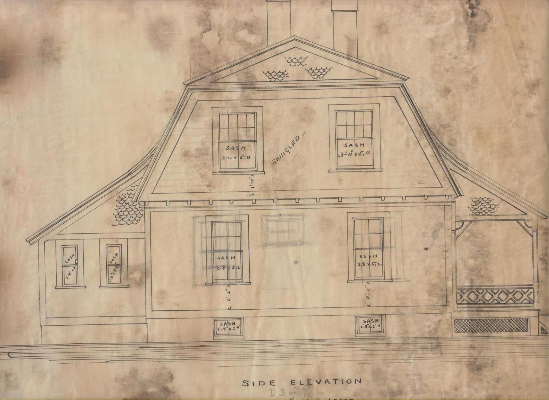 Architectural drawing of cottage (design D-3) in the Oaks, a neighborhood of single-family worker cottages built by the Willimantic Linen Company, the predecessor of the American Thread Company, Willimantic, CT. Side elevation. Scale: 1/4 in. = 1 ft. Designed by noted American (Massachusetts) architect Eugene C. Gardner, among his earliest works.Collection