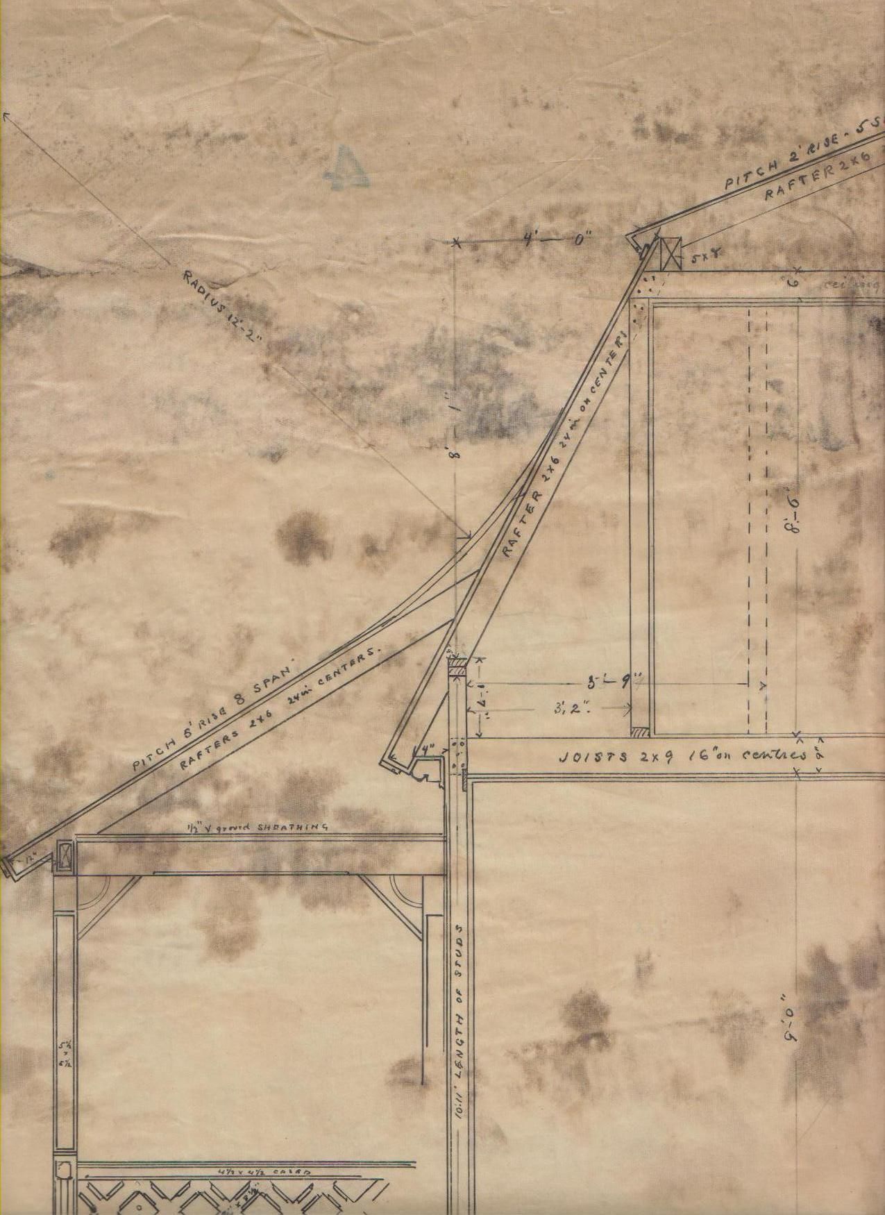 Architectural drawing of cottage (design D-7) in the Oaks, a neighborhood of single-family worker cottages built by the Willimantic Linen Company, the predecessor of the American Thread Company, Willimantic, CT. Detail. Scale: Not states. Designed by noted American (Massachusetts) architect Eugene C. Gardner, among his earliest works.Collection