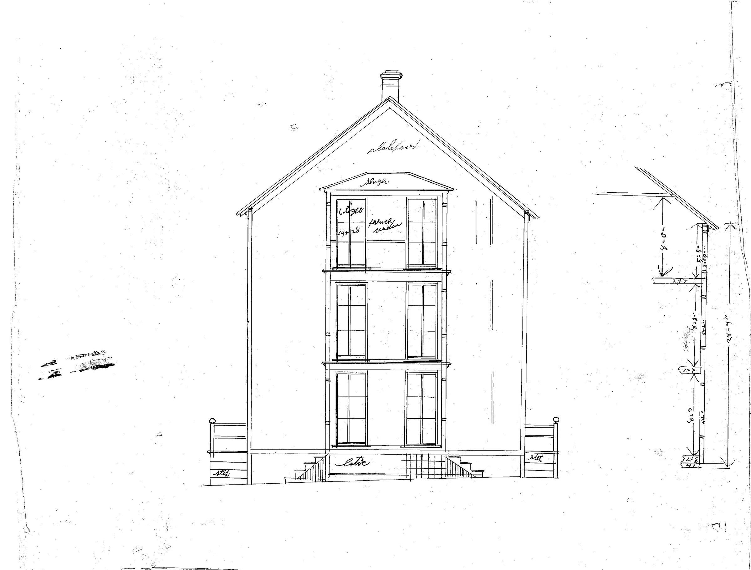Rear elevation of an architectural plan of a three-story tenement. Possibly six units. Found along with architectural plans of company housing of the American Thread Company, Willimantic Mills, Willimantic, CT. Scale: not indicated.Collection