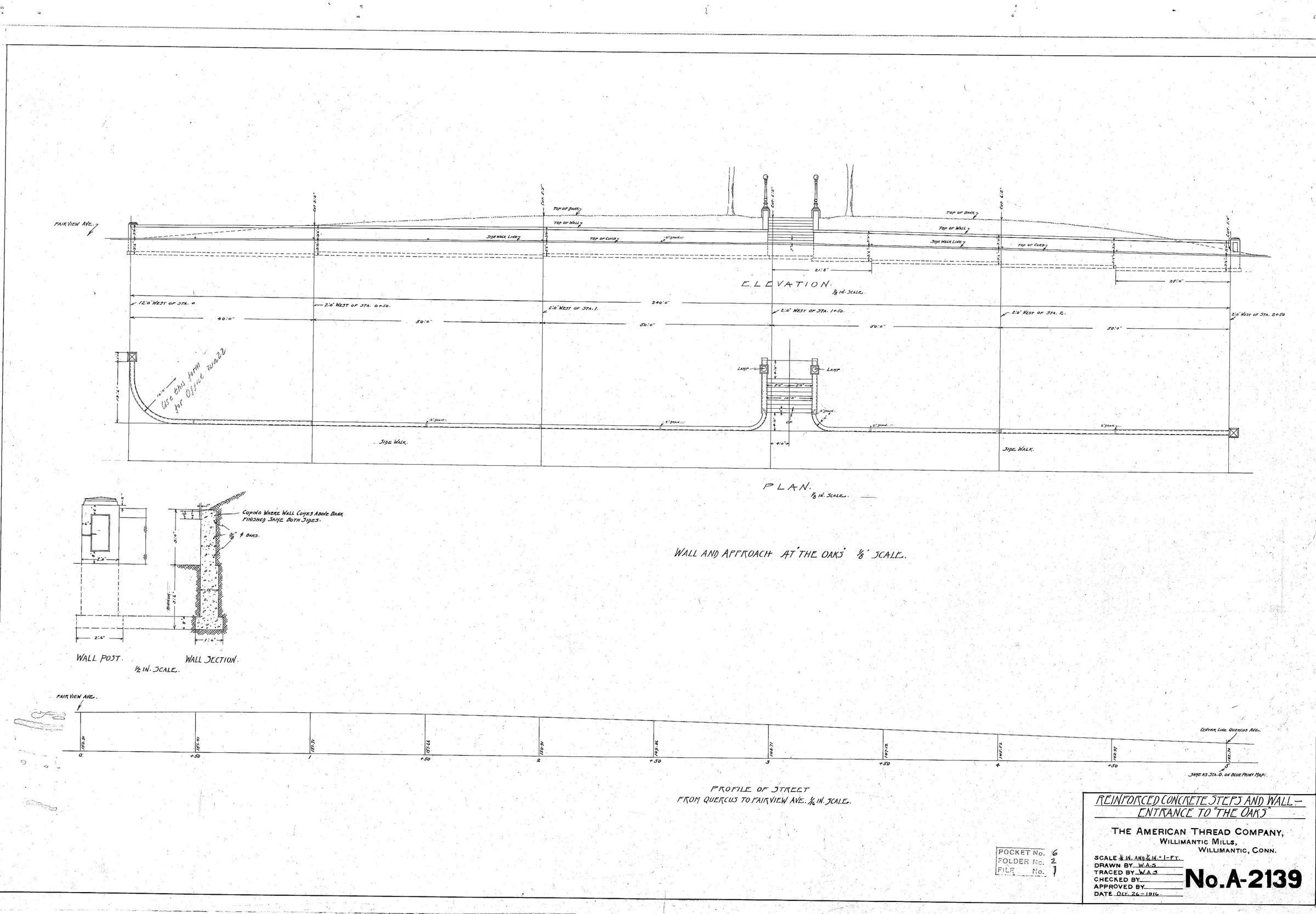 Architectural plan showing the reinforced steps and wall at the entrance to "the Oaks," American Thread Company, Willimantic Mills, Willimantic, CT. Scale 1/8 in. = 1 ft. The steps and wall may be those at the entrance to the former William Elliot Barrows House on Fairview Avenue in Willimantic. Barrows was the General Manager of the Willimantic Linen Company (the predecessor of the American Thread Company) in the 1880s.Collection