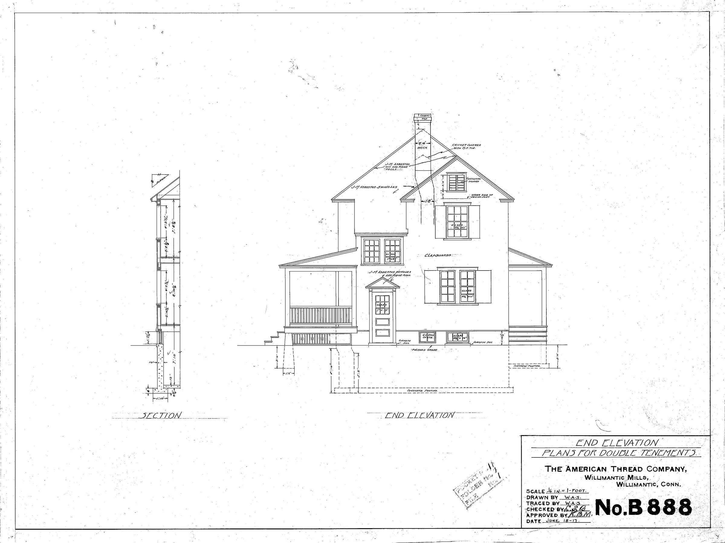 Plans for double tenements, end elevation, the American Thread Company, Willimantic Mills, Willimantic, CT. Iverton, a.k.a., Model Village.Collection