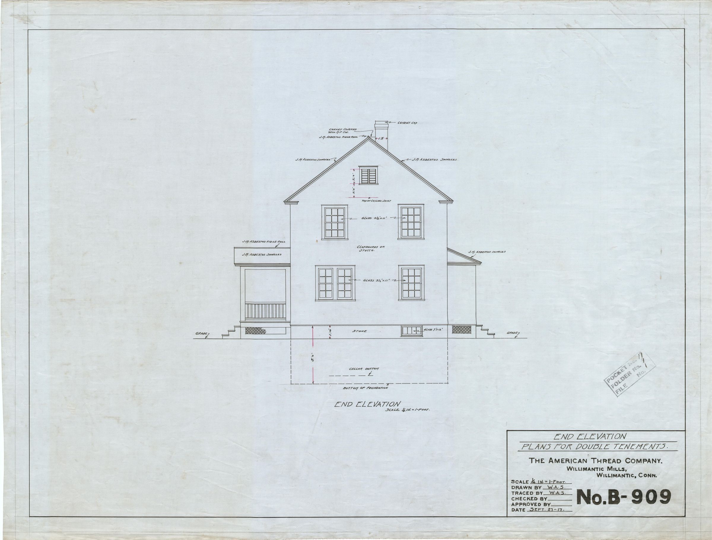 Architectural plan of worker row house, end elevation of double tenement. American Thread Company, Willimantic Mills, Willimantic, CT. Scale: 1/4 in. = 1 ft.Collection