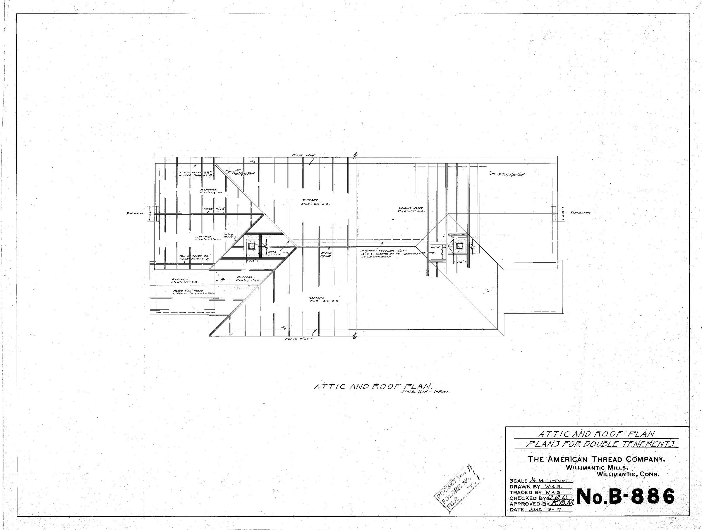 Plan for a double tenement, attic and roof plan, American Thread Company, Willimantic Mill, Willimantic, CT. Scale 1/4 in. = 1 ft.Collection