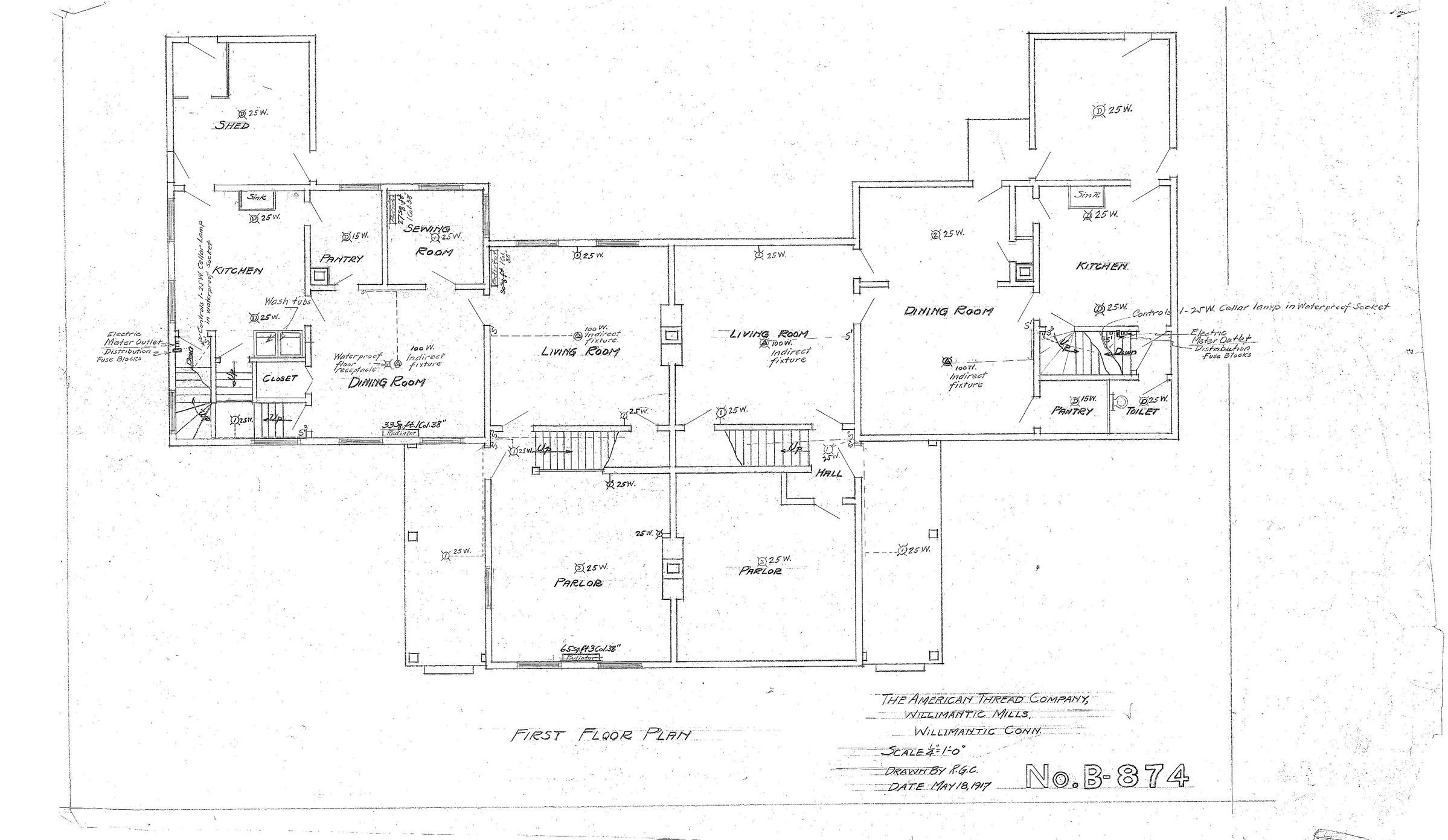 Architectural plan of worker row house, duplex, first floor, American Thread Company, Willimantic Mills, Willimantic, CT. Scale: 1/4 in. = 1 ft.Collection