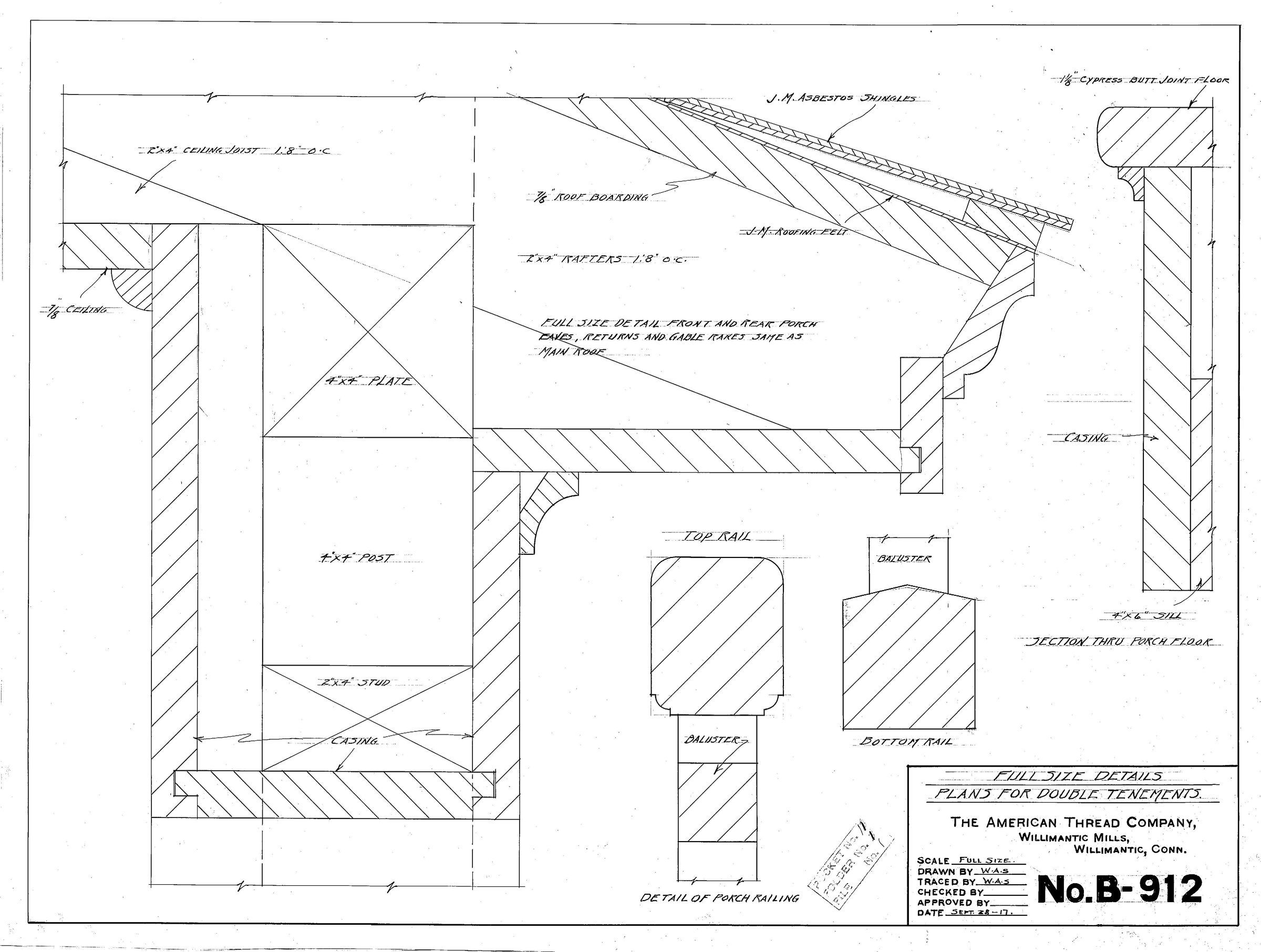 Plan for double tenements, full size details, rails, eaves, etc., American Thread Company, Willimantic Mills, Willimantic, CT. Scale: full size.Collection