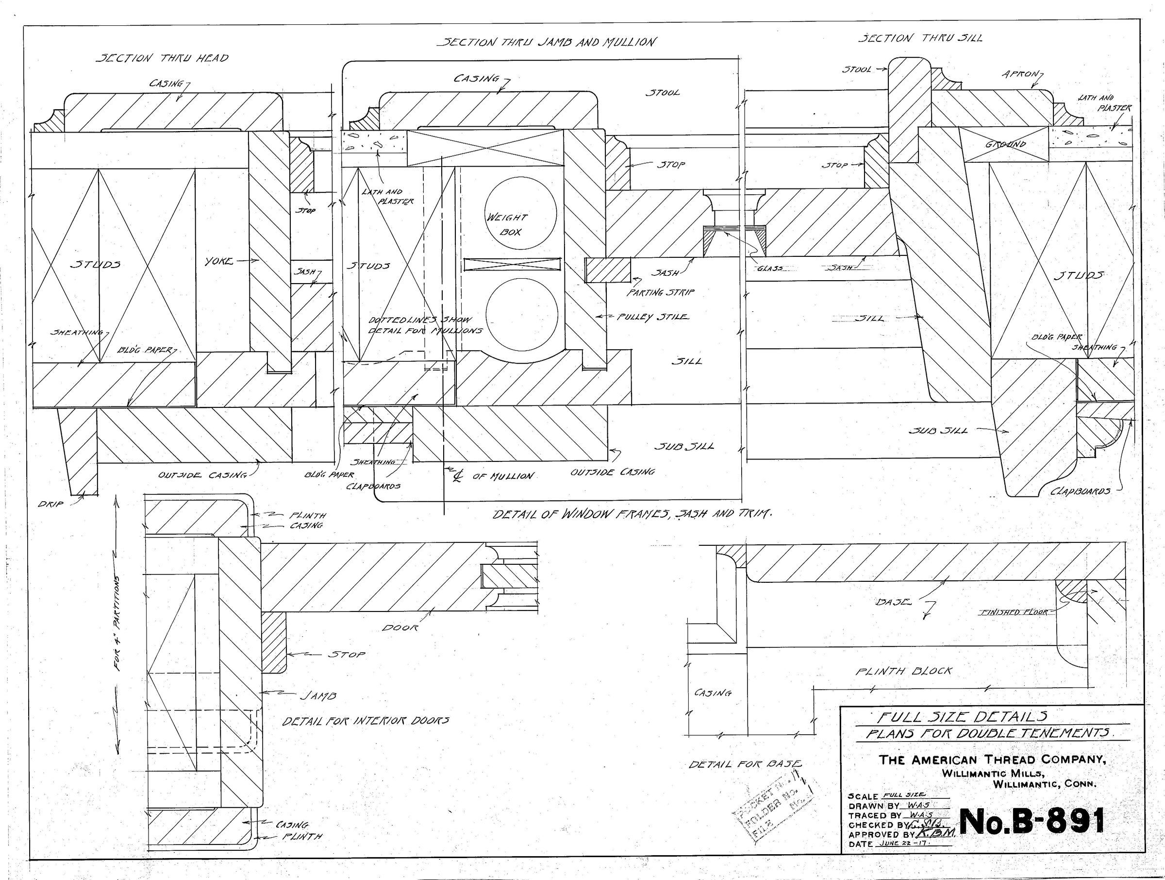 Plan for double tenements, full size details, American Thread Company, Willimantic Mills, Willimantic, CT. Scale: full size.Collection