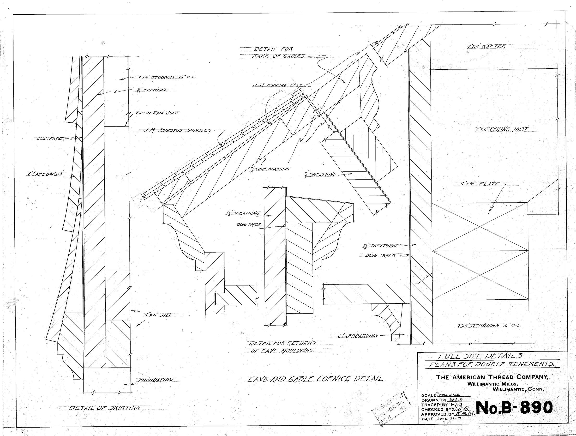 Plan for double tenements, full size details, eaves, cornices, etc., American Thread Company, Willimantic Mills, Willimantic, CT. Scale: full size.Collection