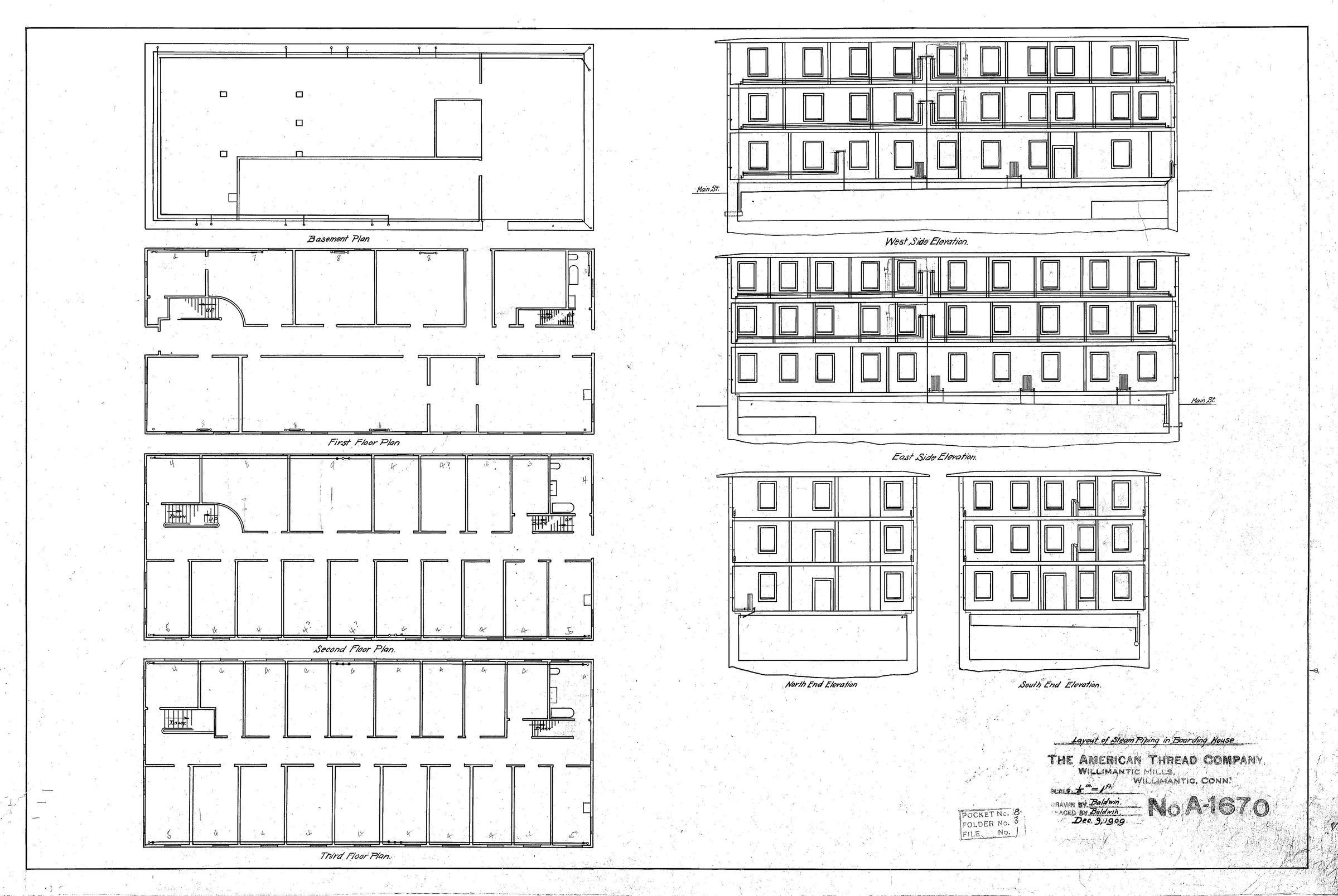 Layout of steam piping in Elms boarding house, American Thread Company, Willimantic Mills, Willimantic, CT. The Elms was constructed by the Willimantic Linen Company (the predecessor of the American Thread Company) in the late 1800s, and was probably originally heated with coal stoves and fireplaces. This architectural plan indicated that the American Thread Company may have converted it to steam heat in 1909. Normally, the Elms housed single female operatives, two to a room, although in 1880 both male and female operatives lived there, on different floors. The men were older, mostly married, mostly skilled, and mostly immigrants from Britain; the housing may thus have been temporary, until their families arrived. The 1880 female residents were mostly in their teens and twenties, single, semi-skilled, and American-born. Scale: 1/9 (?) in. = 1 ft.Collection