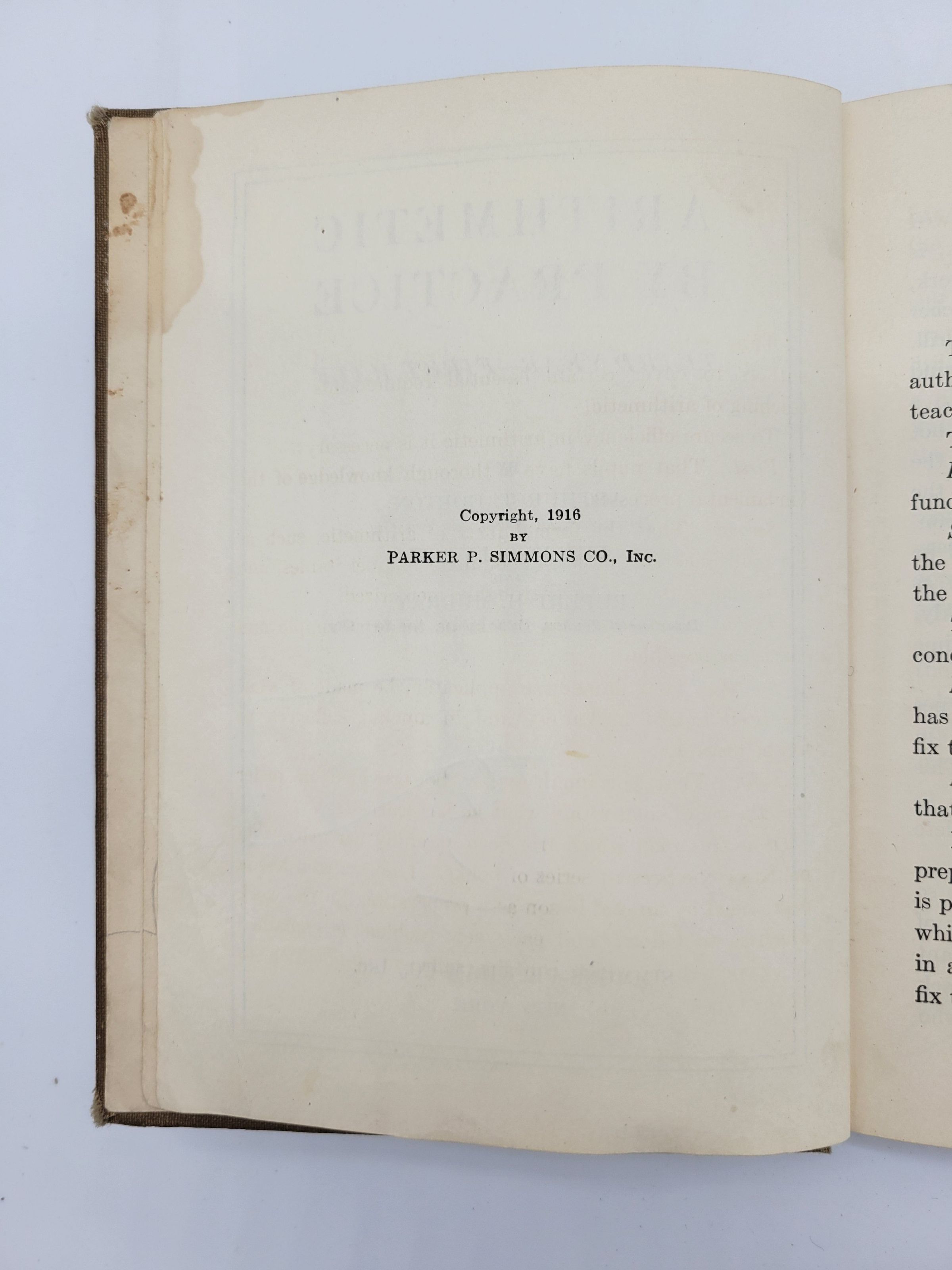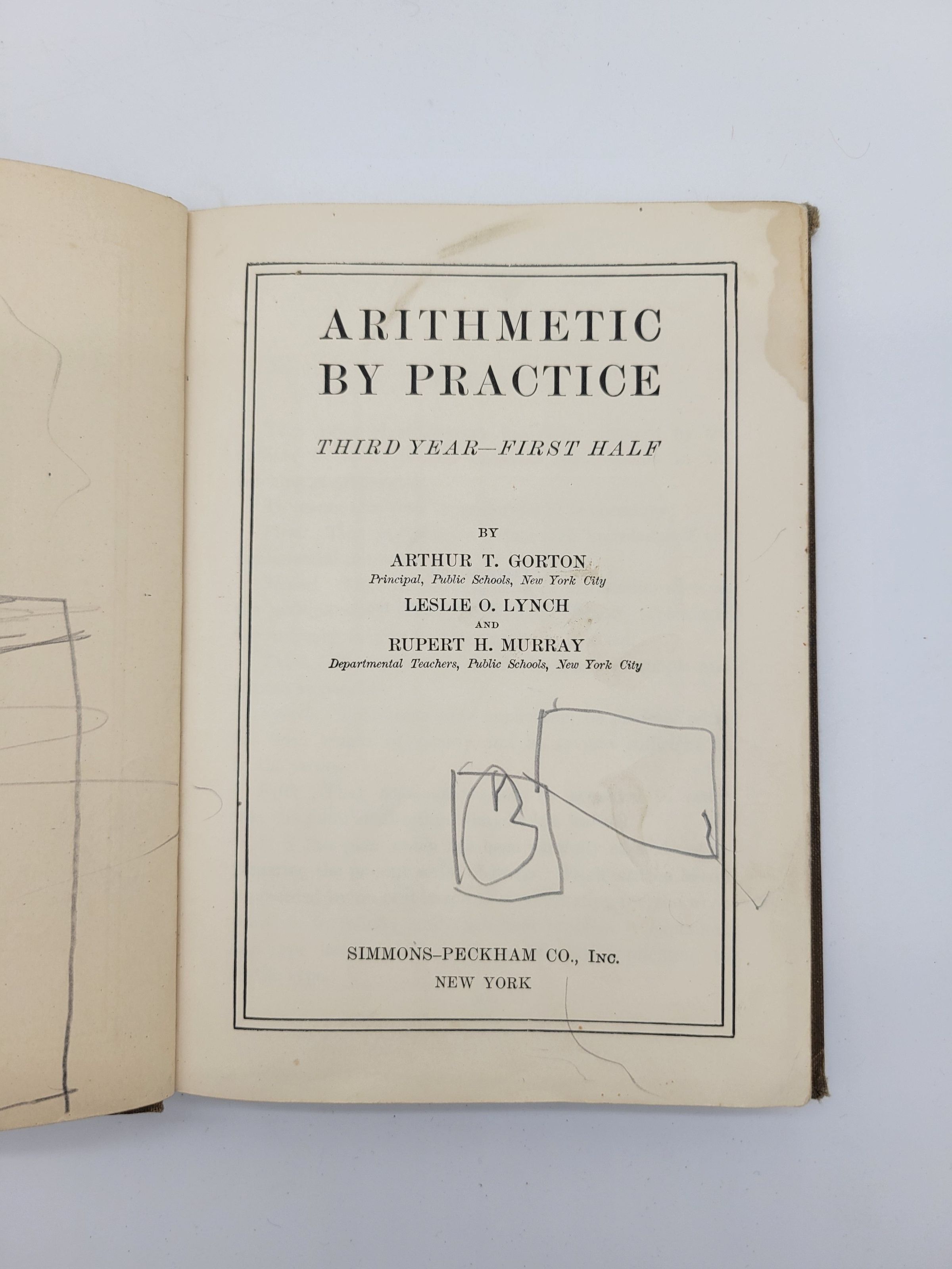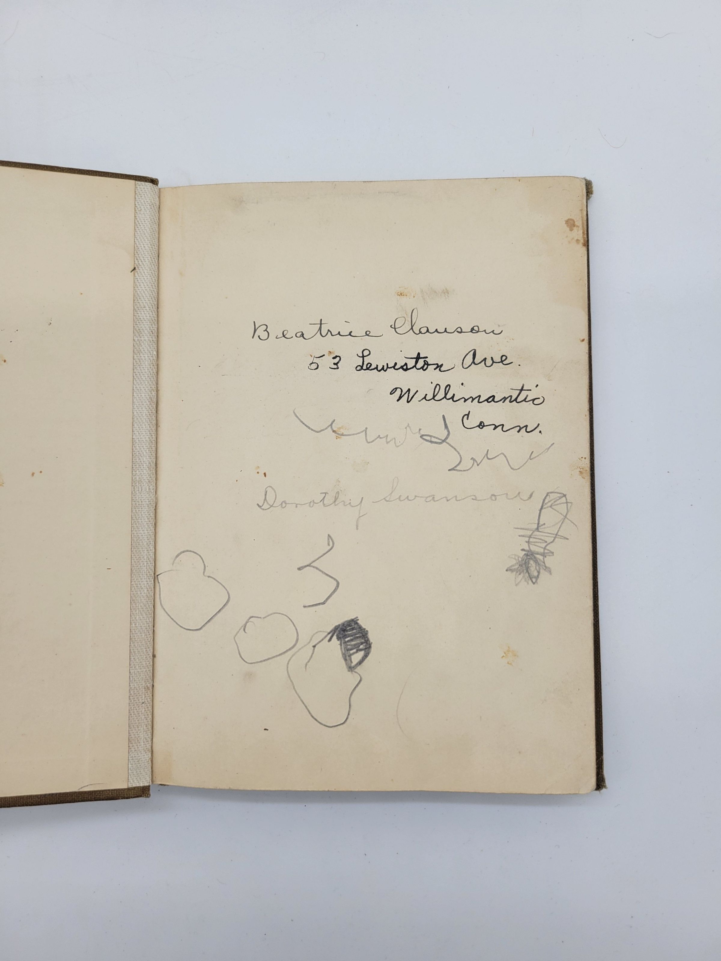 An arithmetic textbook published in 1916. On the front flyleaf is handwritten "Beatrice Clauson/ 53 Lewiston Ave./ Willimantic, Conn." and "Dorothy Swanson" along with some pencil drawings/doodles which are also found throughout the book. Beatrice Clauson of Willimantic was born in 1918 so this book was likely used by her in the 1920s.Collection