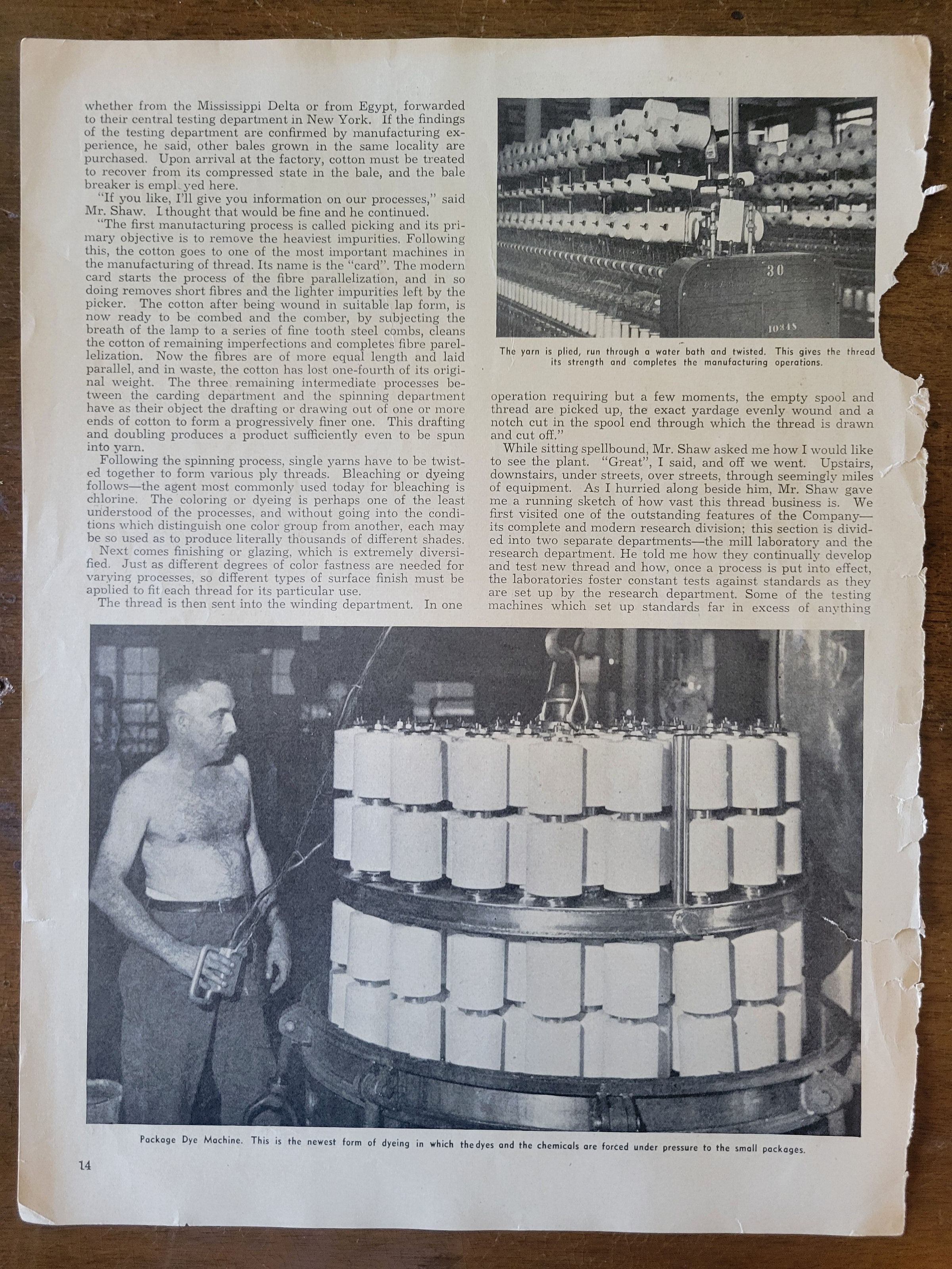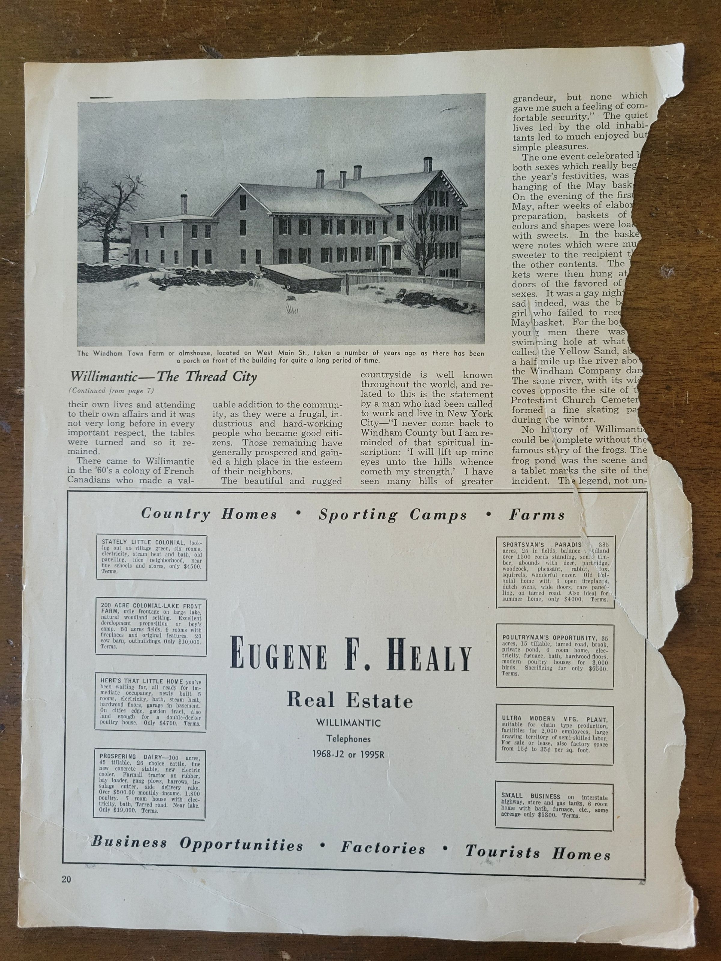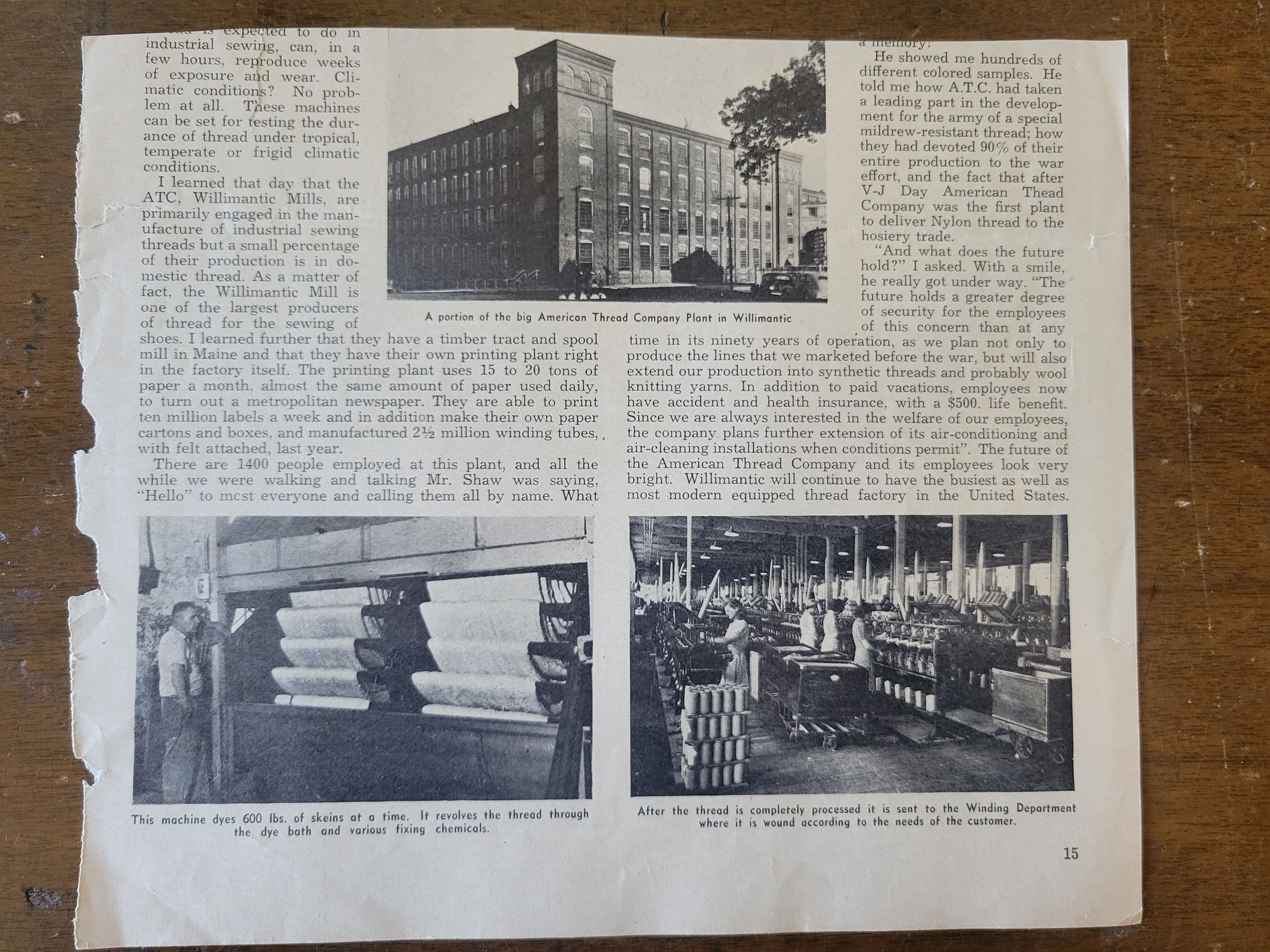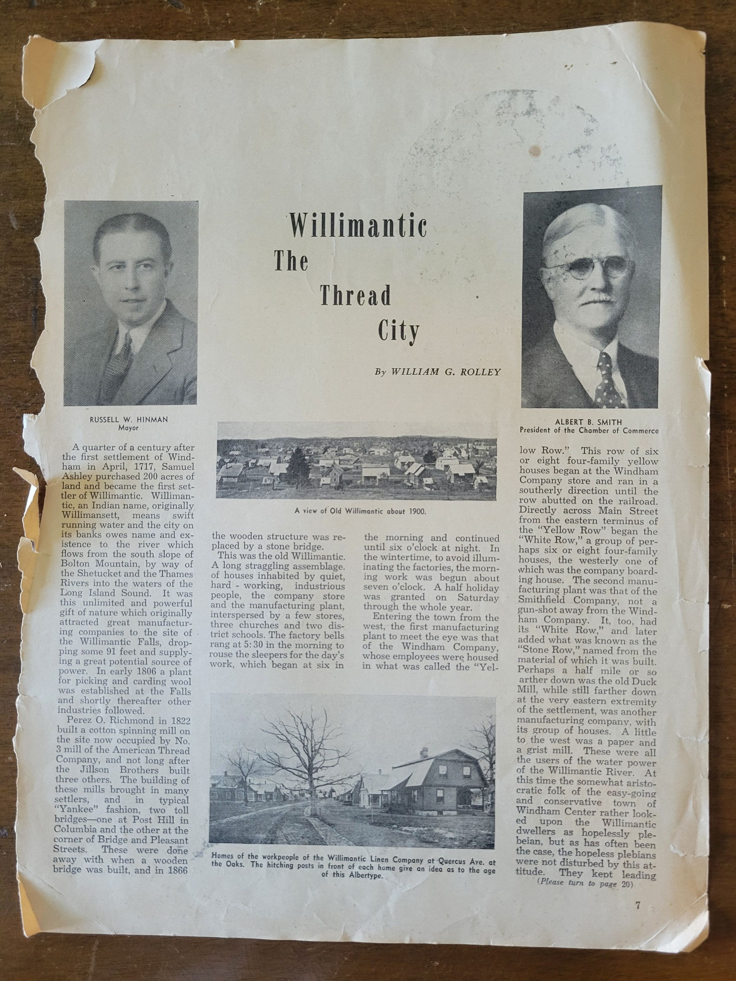 A series of pages torn from a publication containing three articles about Willimantic and its mills. All pages are torn jaggedly at the binding edge, and page15/16 has been cut in half.Collection