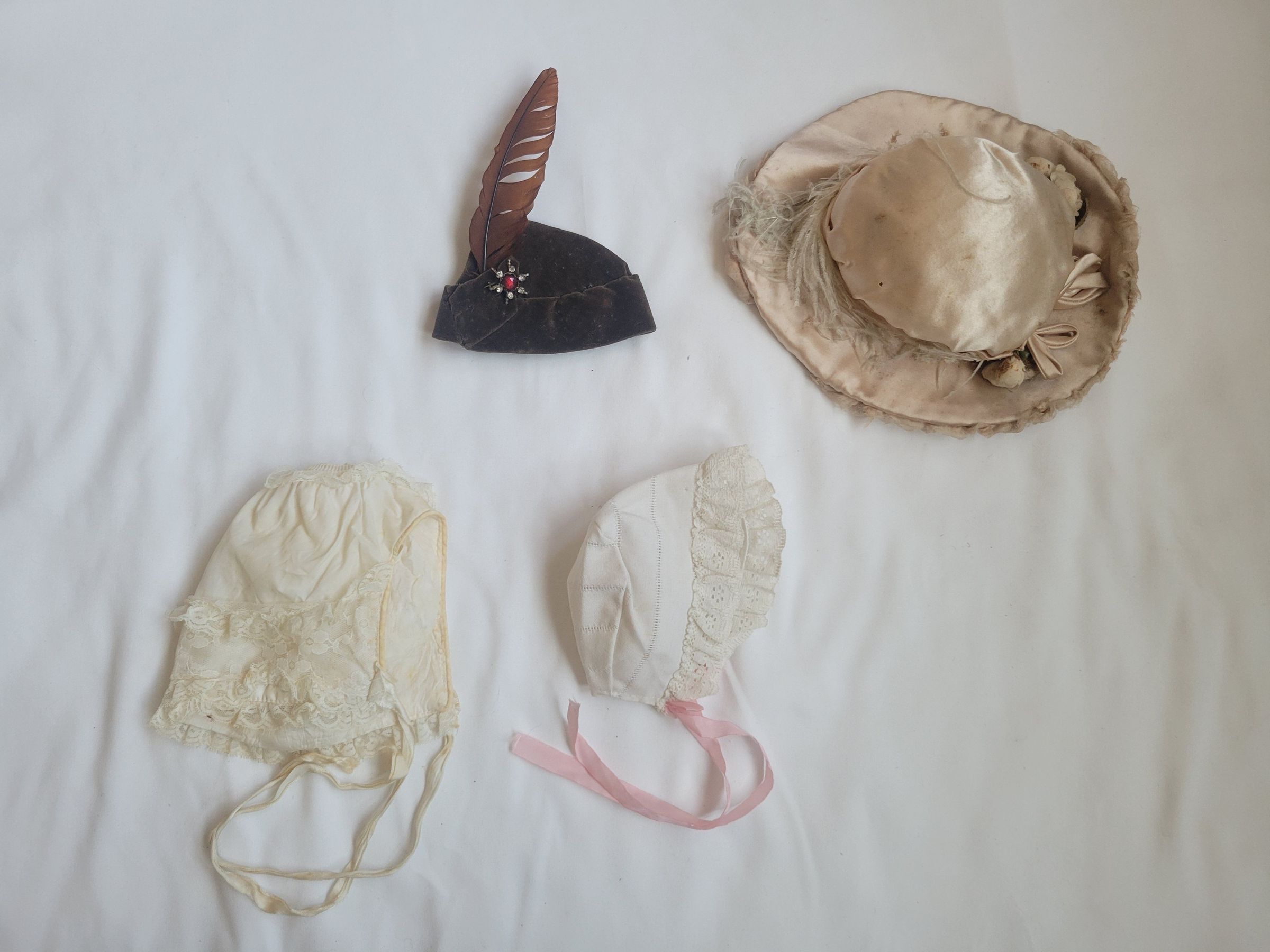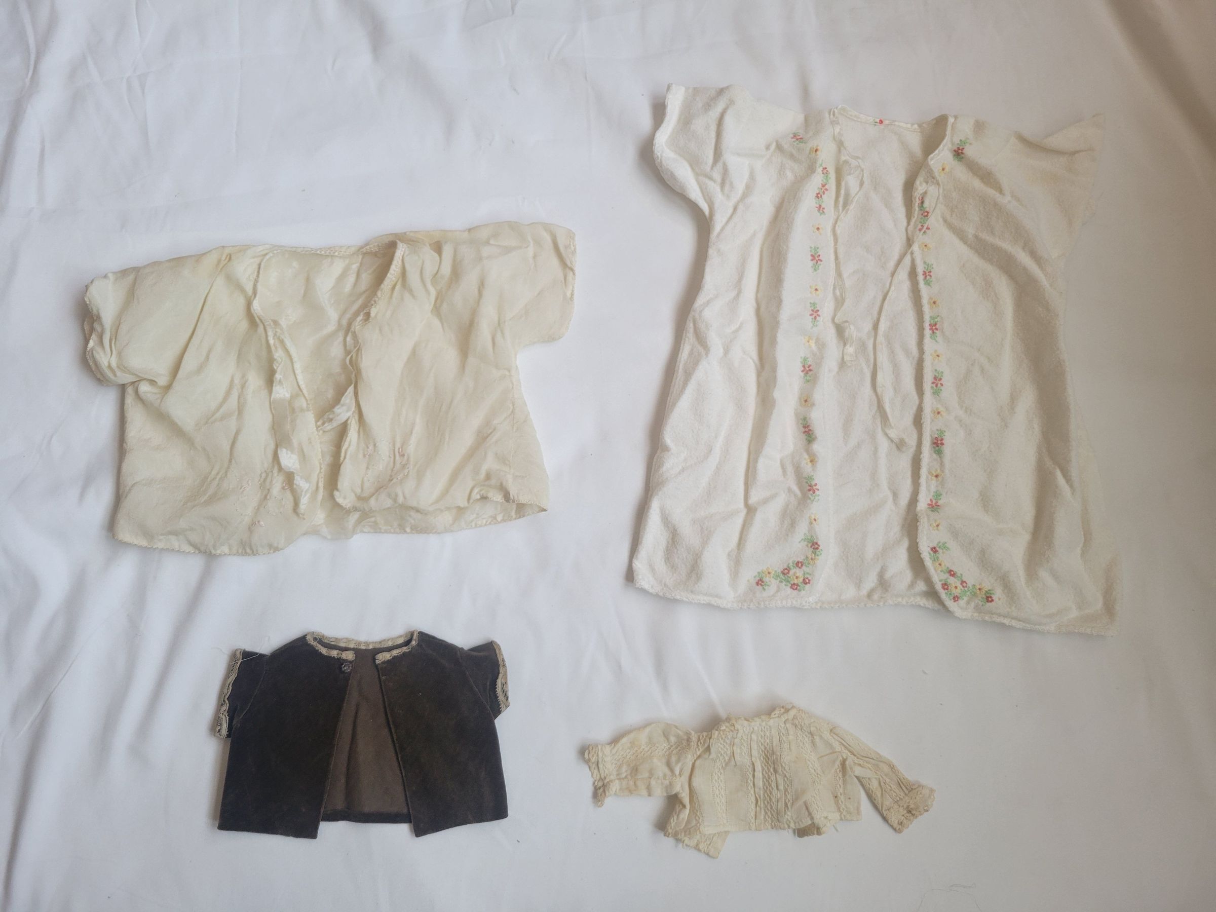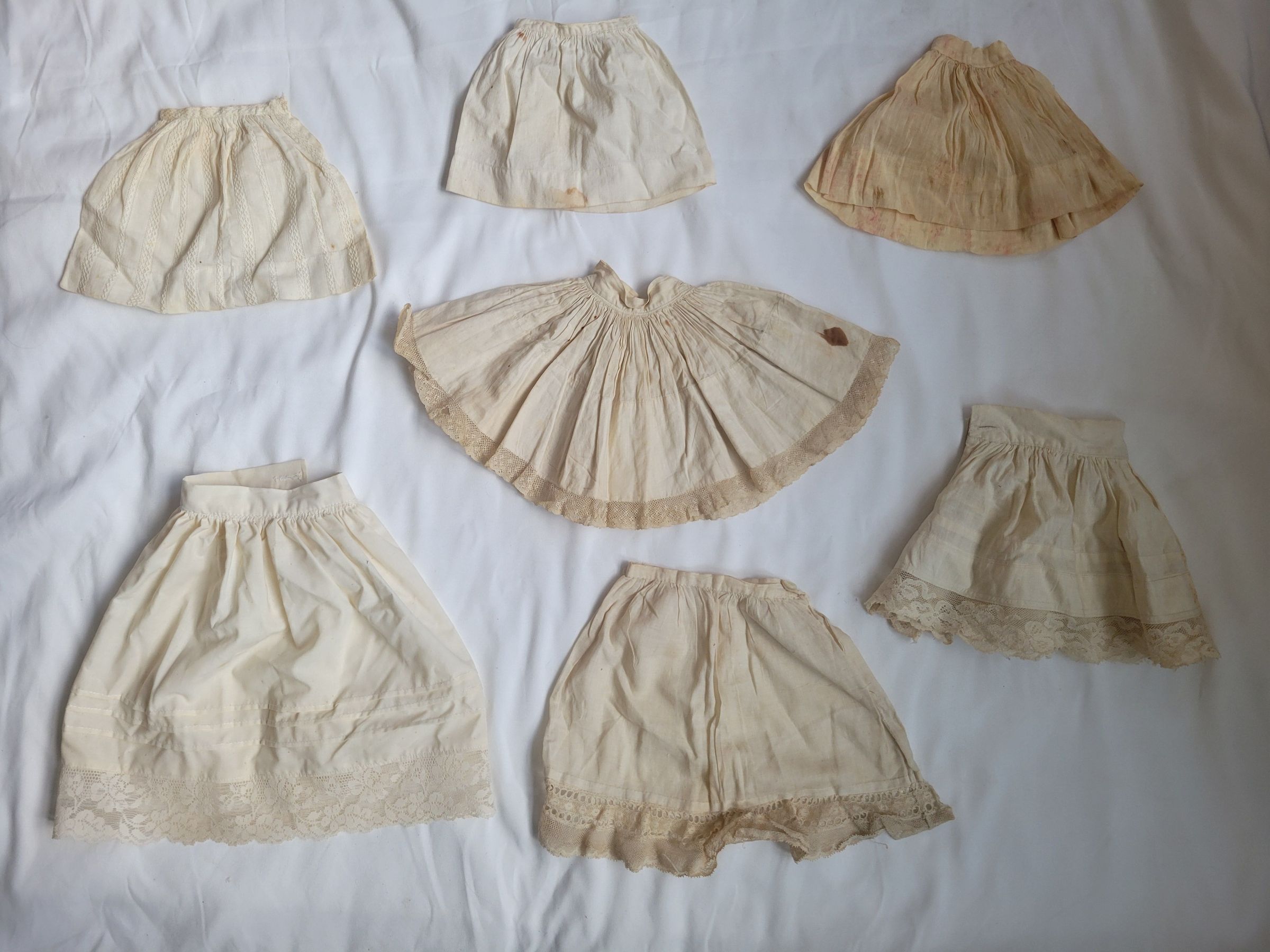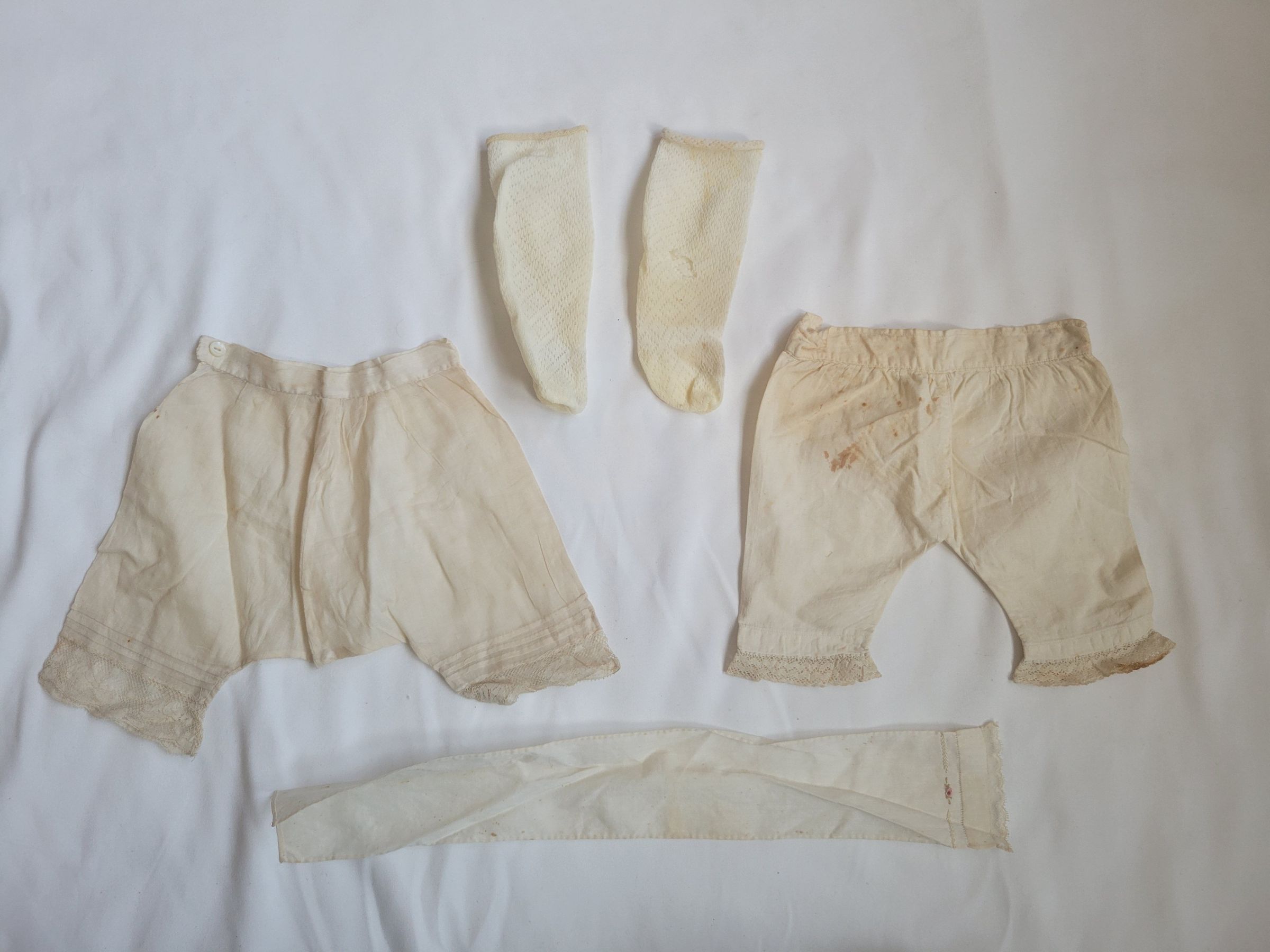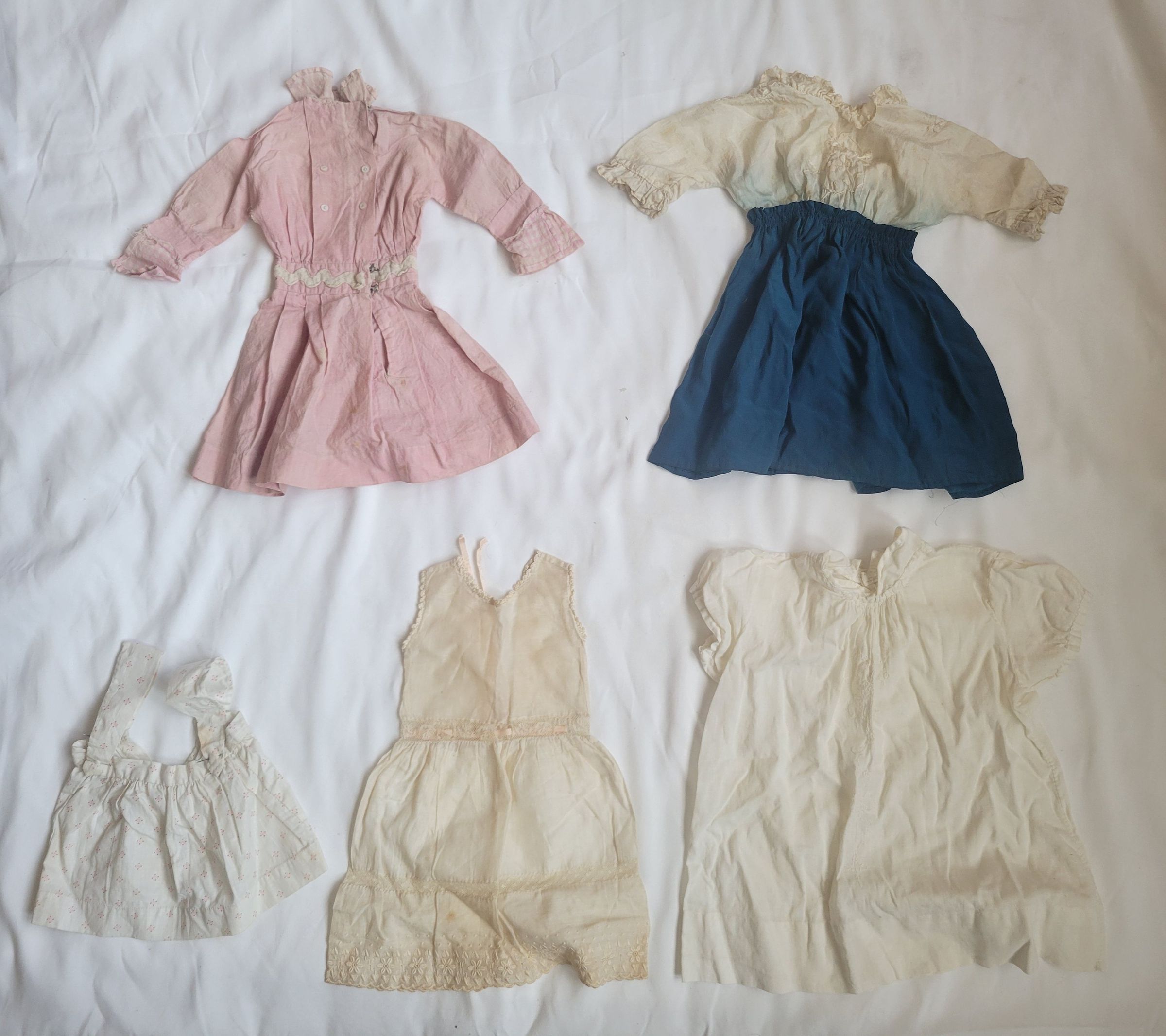 An assortment of dolls' clothes. Dresses, petticoats, jackets, bloomers, socks, bonnets, and hats. All are stained to some degree.Collection
