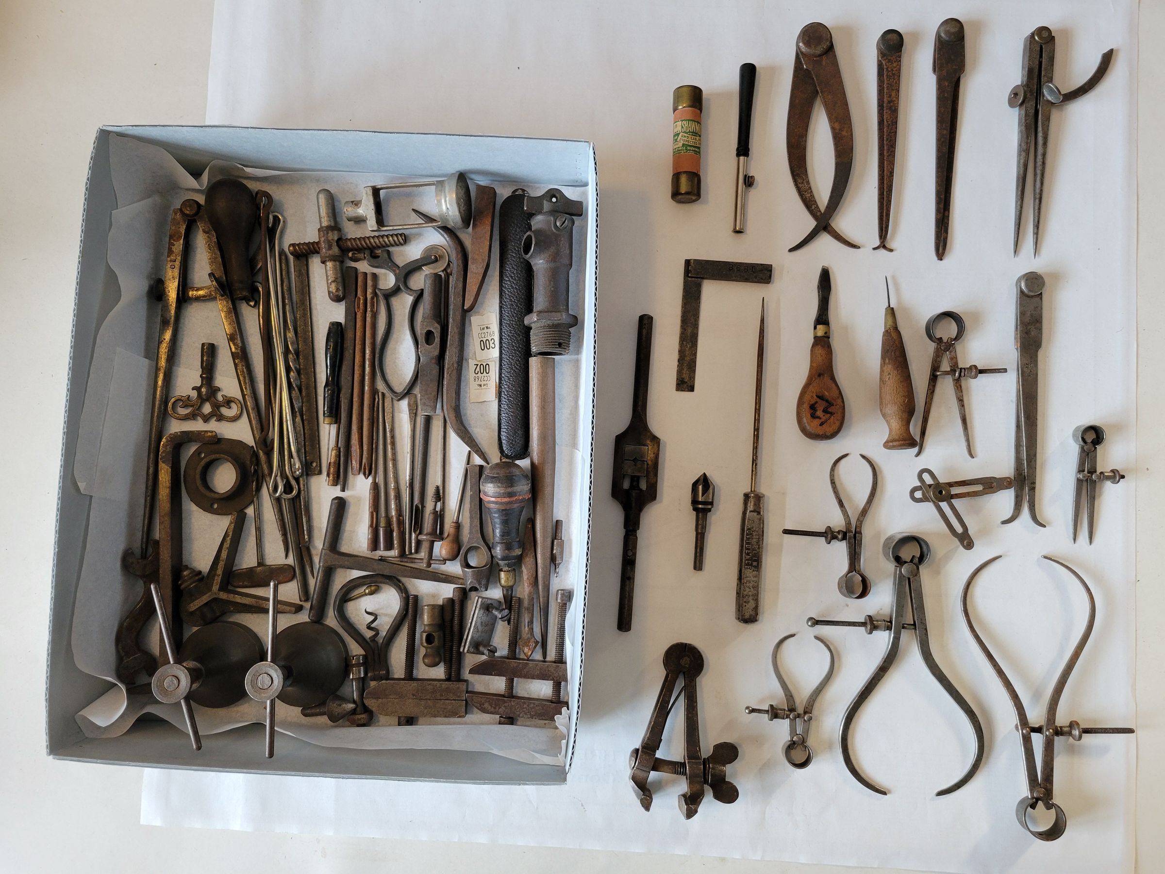 A collection of machining tools from the early 20th century. Most show signs of rust and wear.Collection