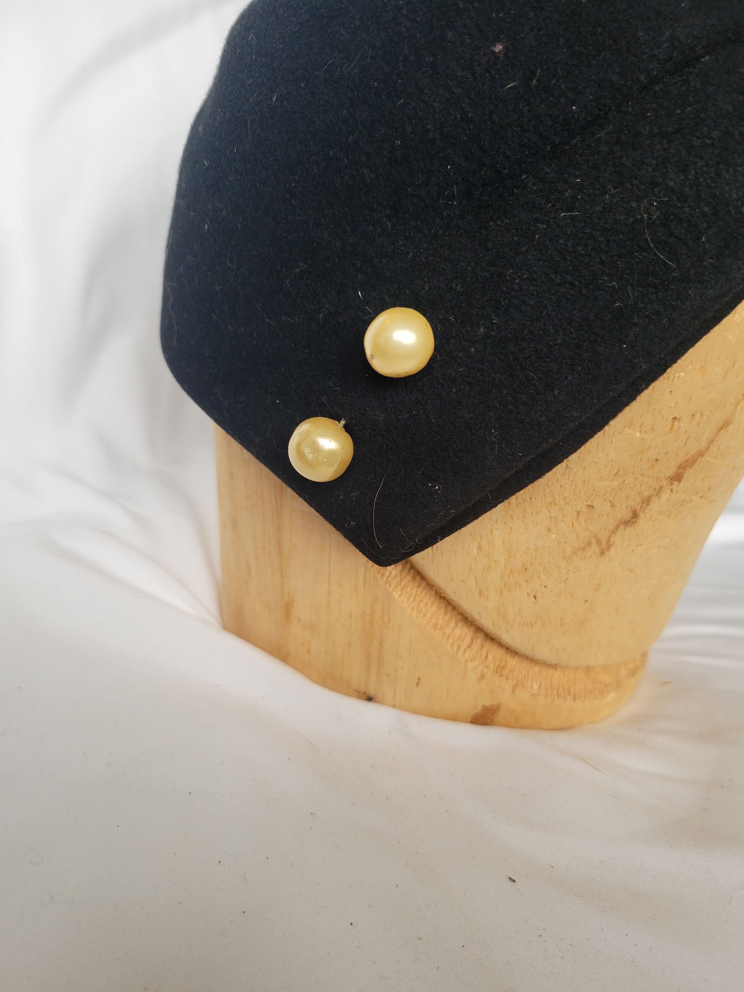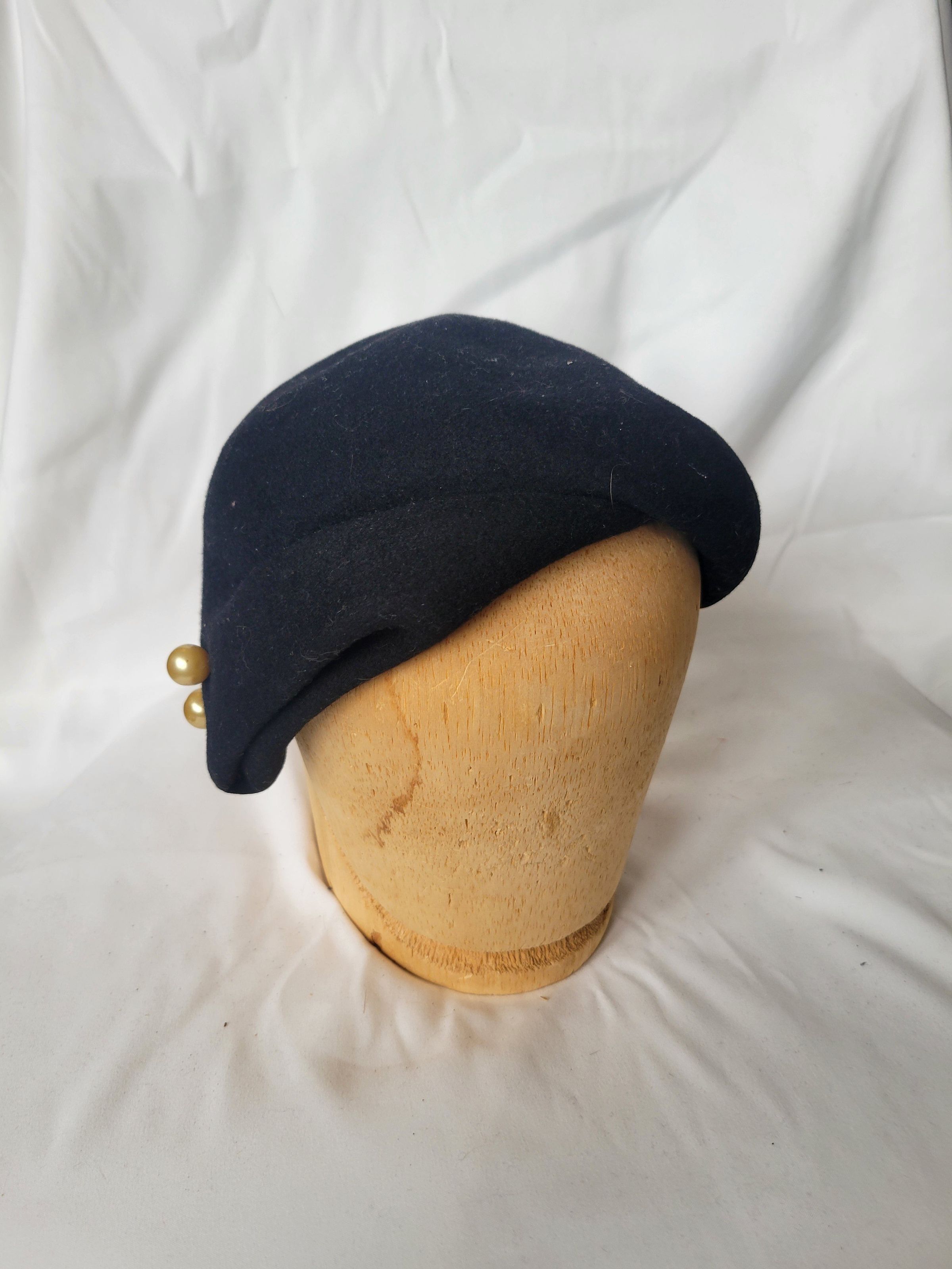 An asymmetrical black felt cloche style hat with faux pearls on the pointed (right) side.Collection