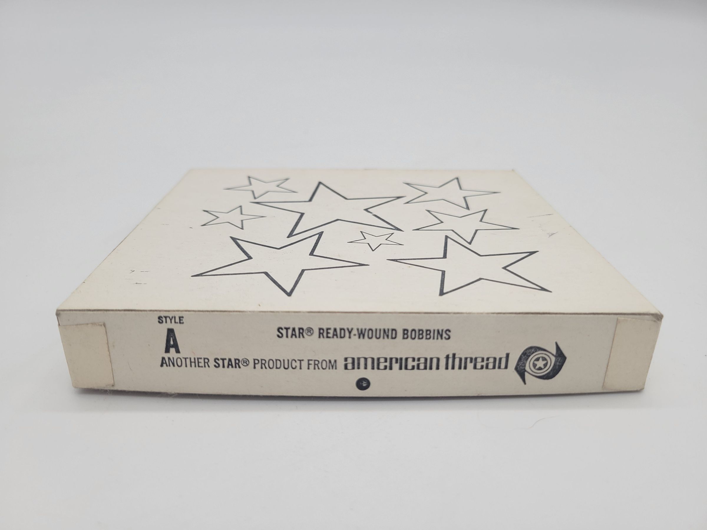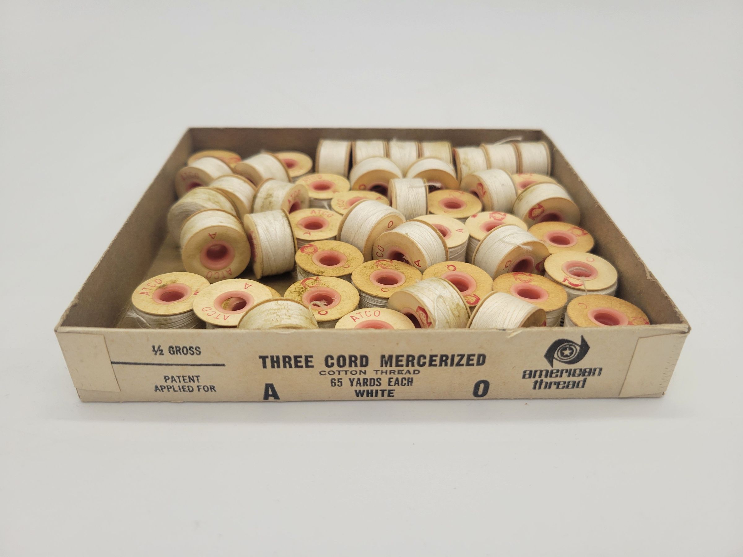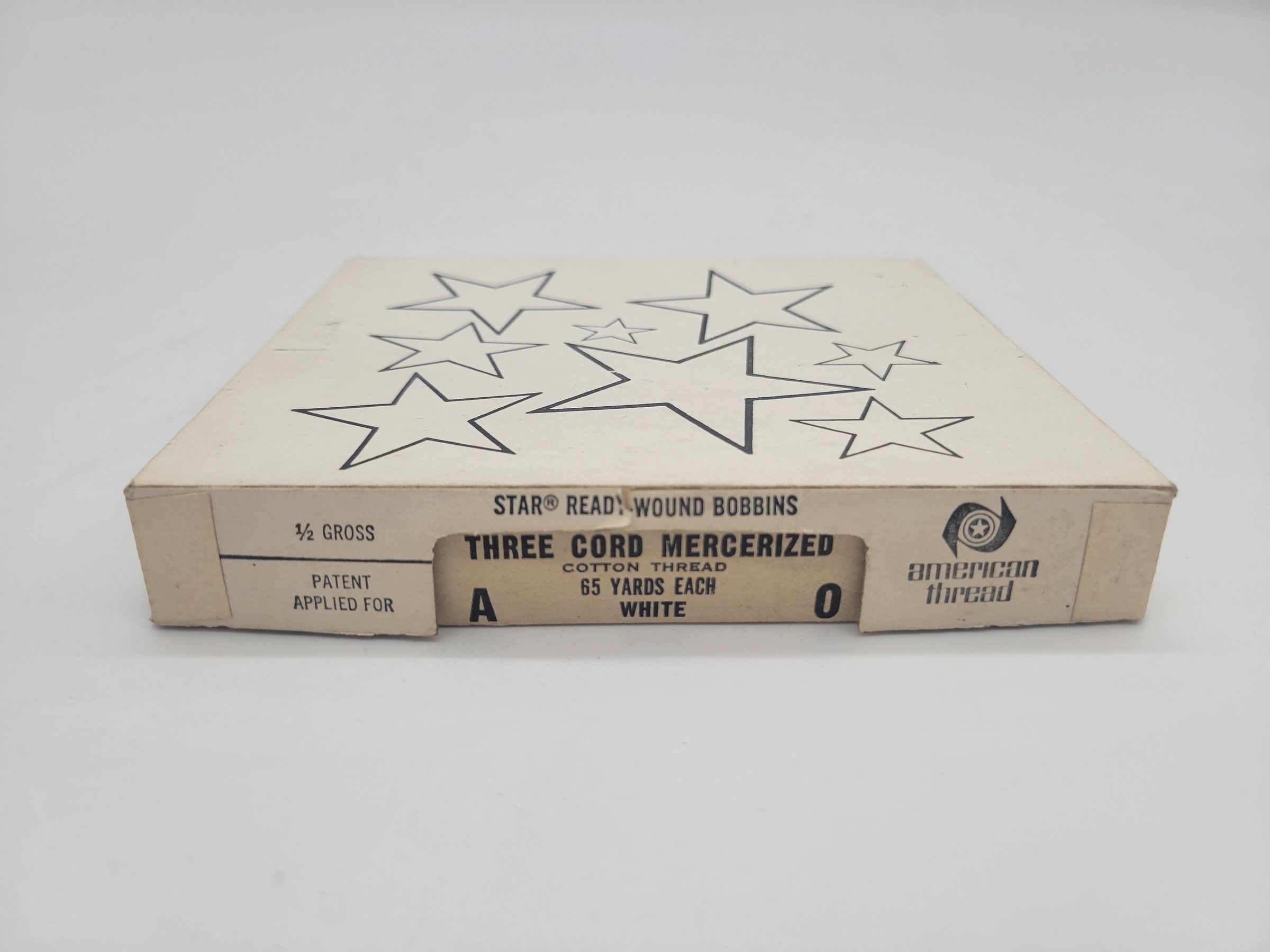A cardboard box of Star white three cord mercerized ready-wound bobbins from the American Thread Company. The box originally contained half a gross (72) bobbins but now has just over half that many. The box indicates that each bobbin holds 65 yards of thread. These types of bobbins are used on home sewing machines to complete the bottom half of the stitches they create. The box is in good condition with only one small rip on one side of the lid. The bobbins and thread are largely stained.Collection