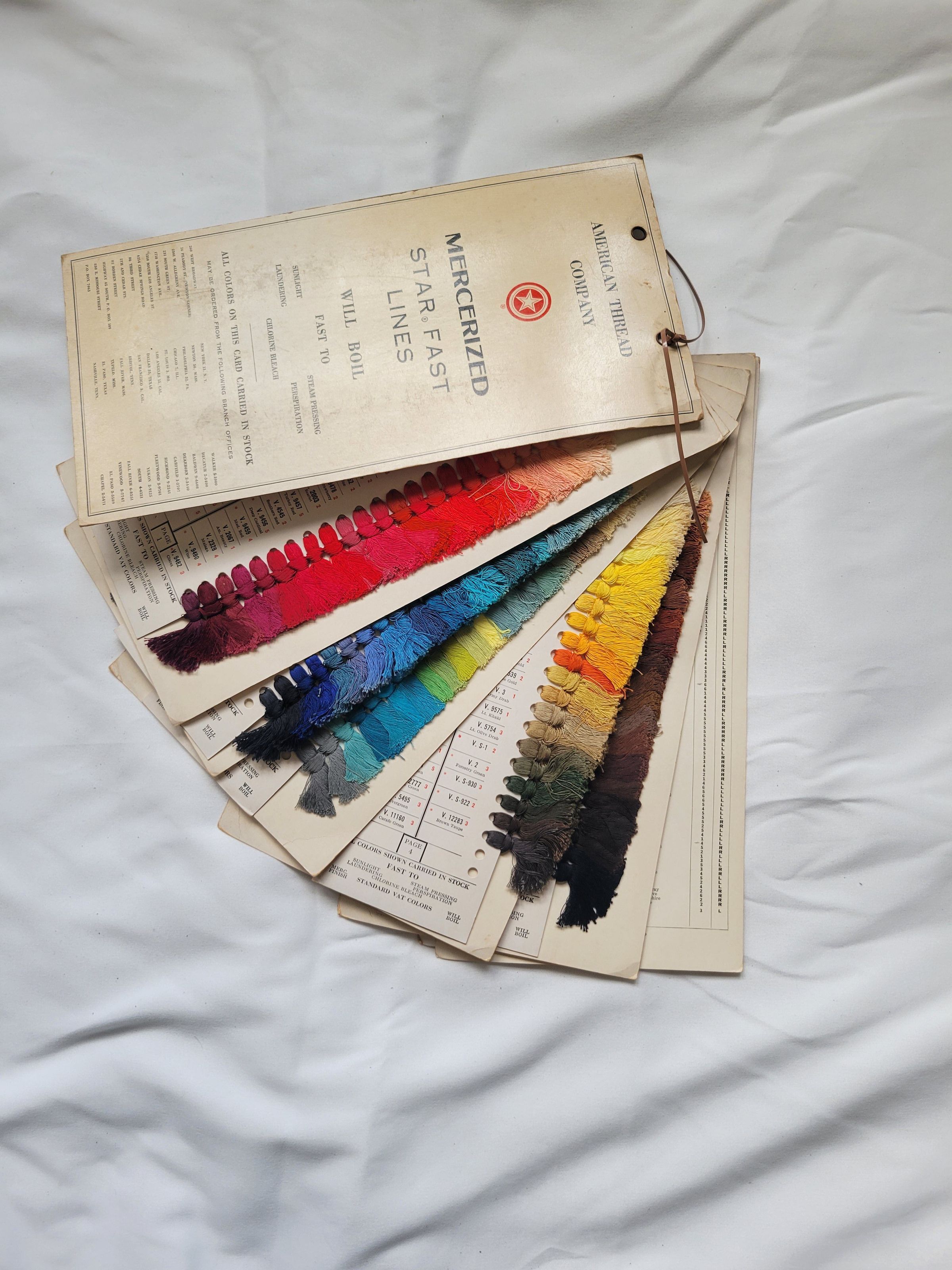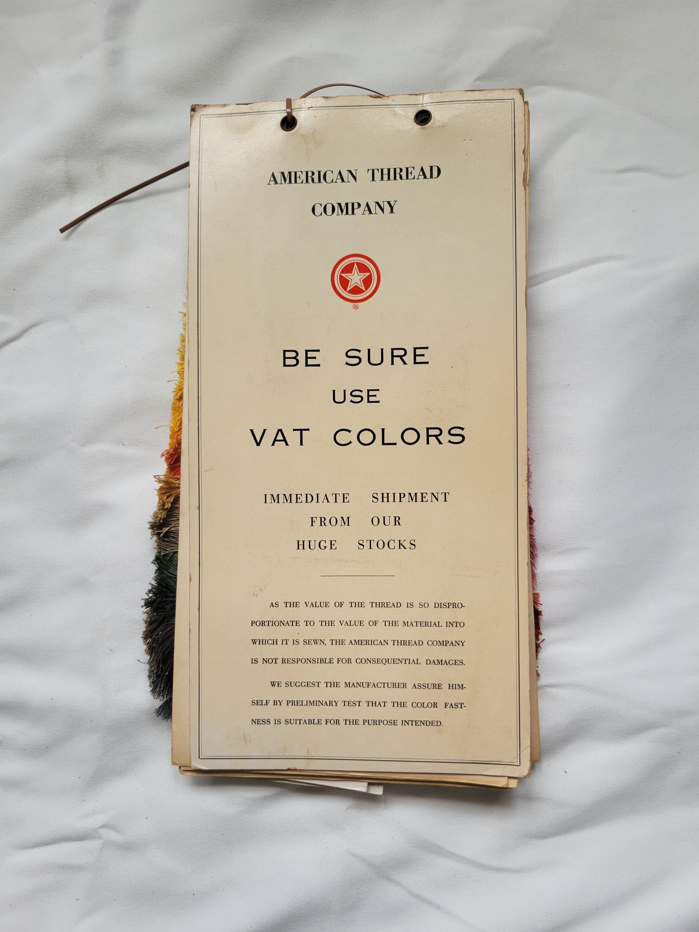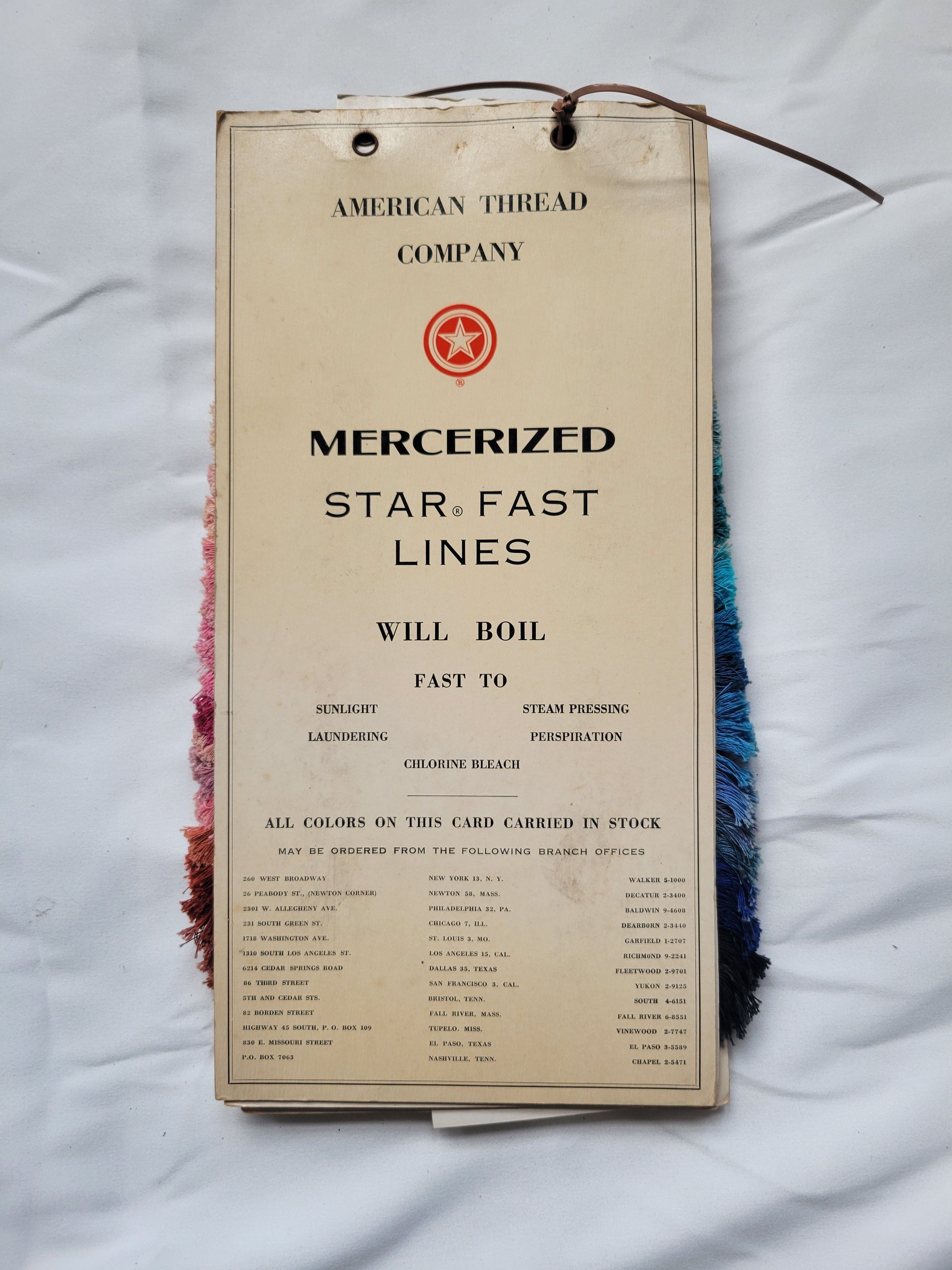 A sample book from the American Thread Company for Mercerized Star Fast Lines thread. Mercerized thread is put through a special process for increase dye adherence and vibrance. The book includes six cards of samples, all with two metal eyelets at the top for incorporation into a binder. It is currently held together with brown plastic cording.Collection