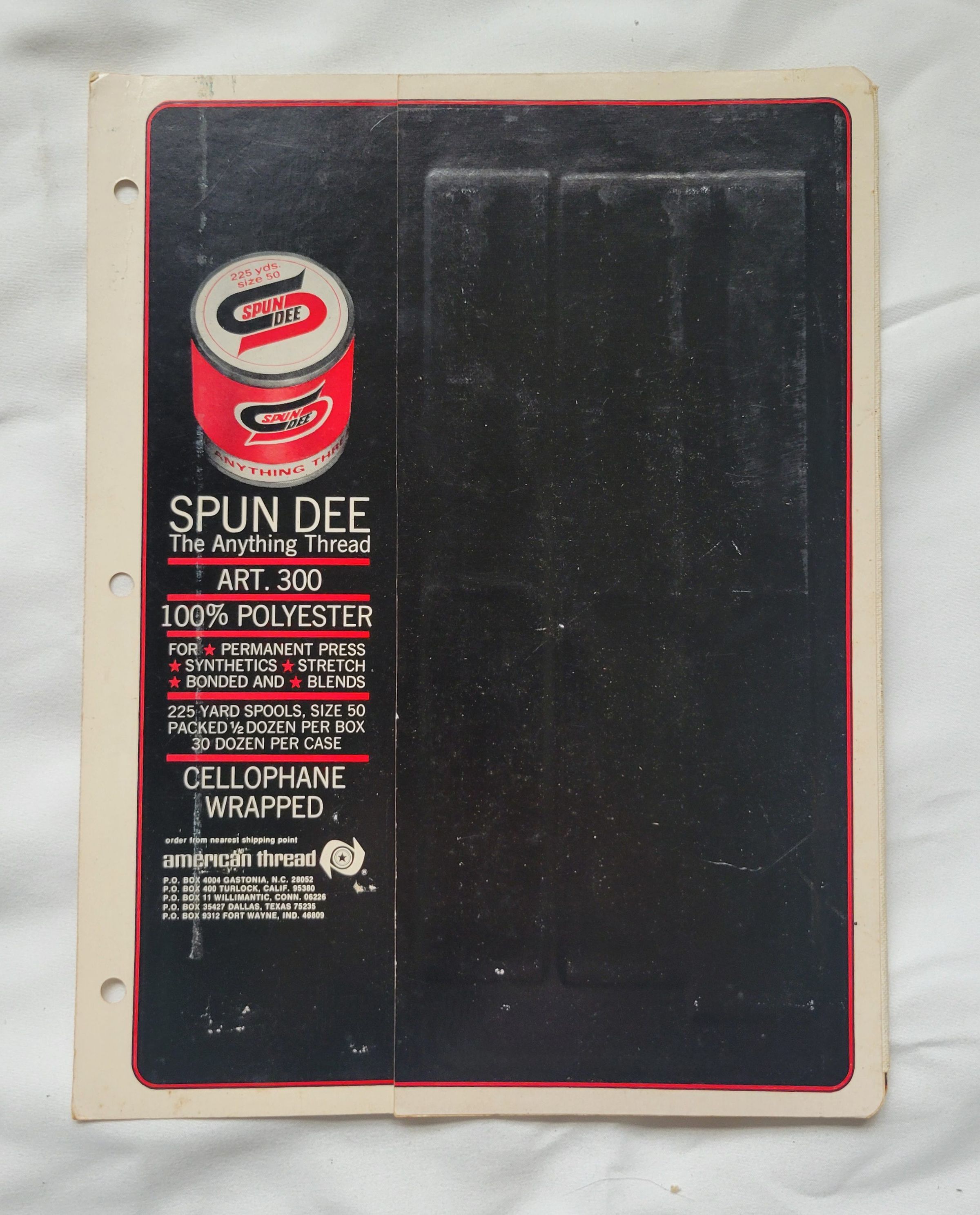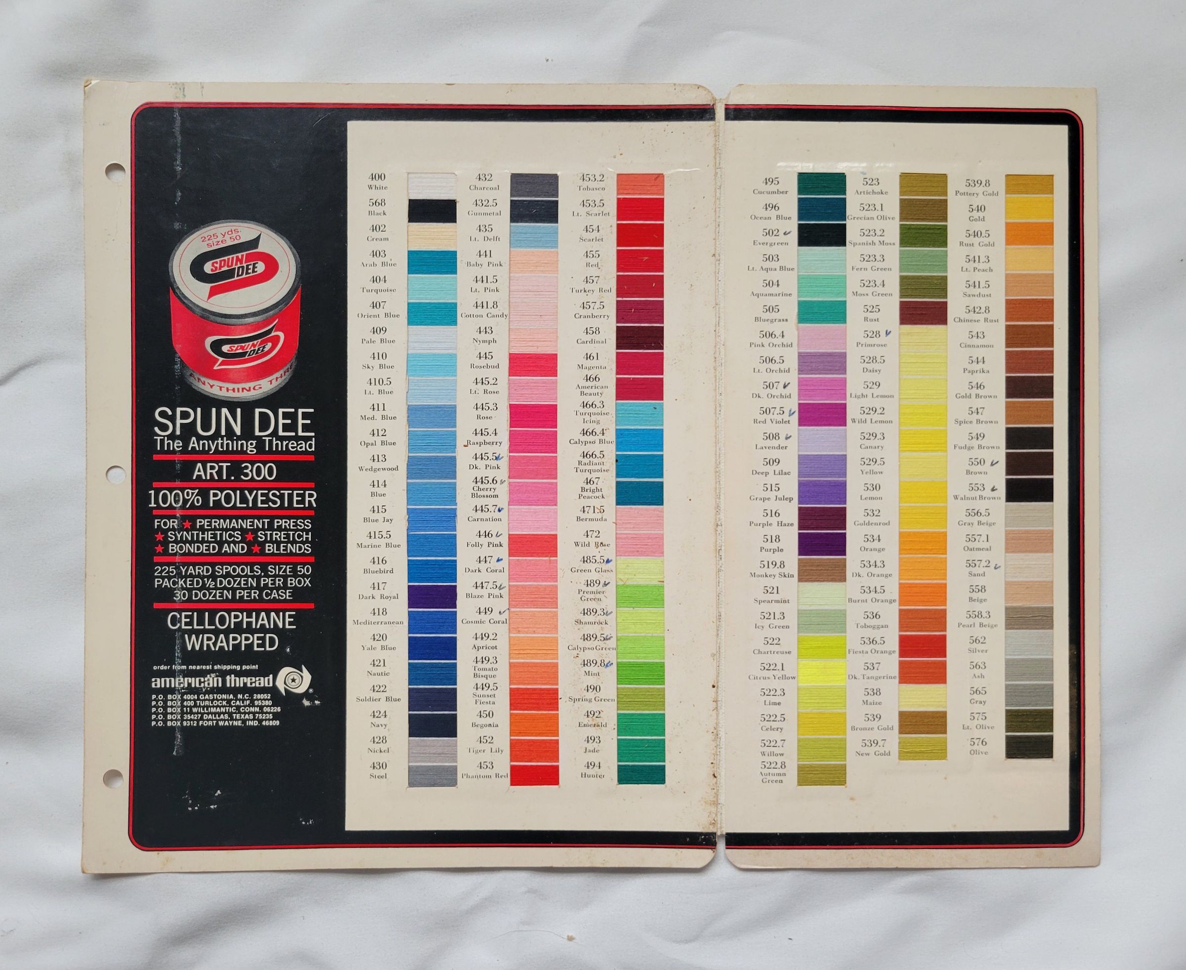 A sample booklet of colors for Spun Dee thread by the American Thread Company, circa 1970. The outside of the booklet is worn but the colors inside are still very clean and vibrant. There are three holes on the left side of the booklet, as this was likely part of a larger binder of samples.Collection