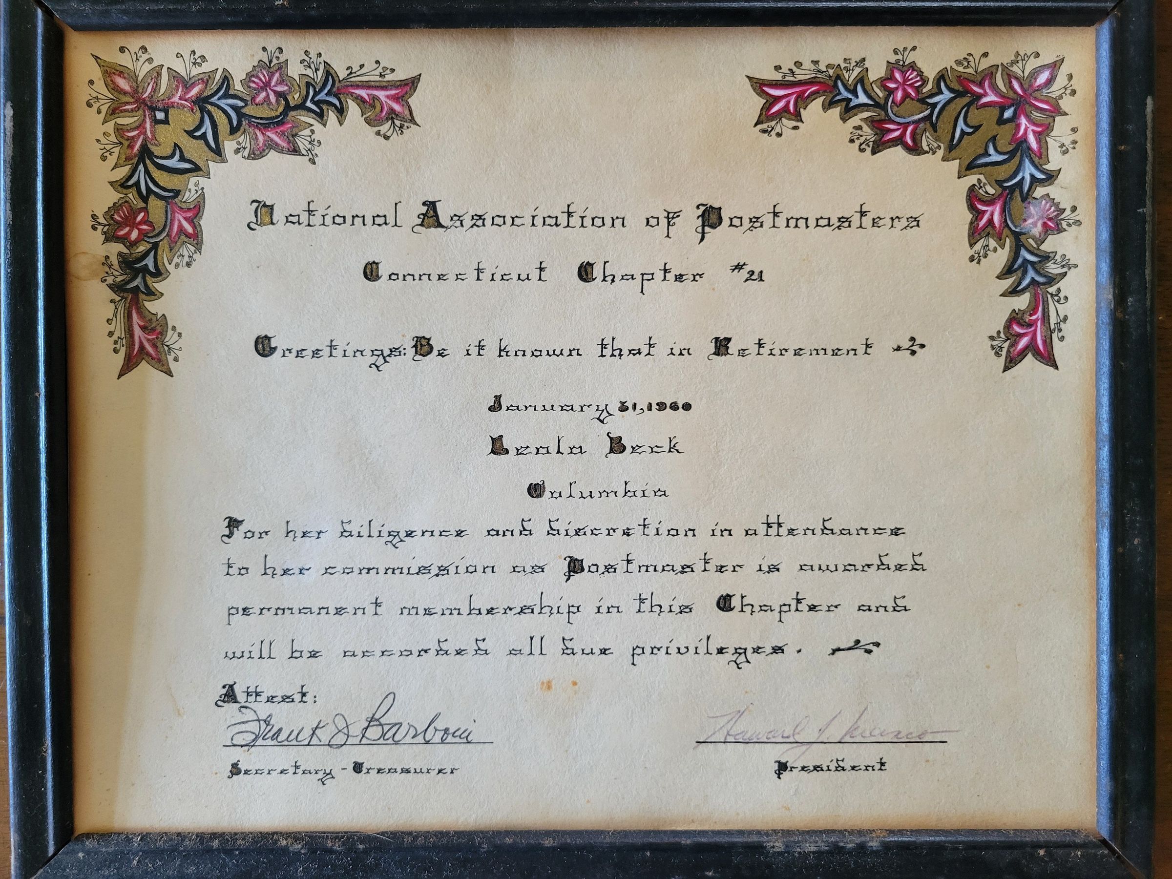 A handmade certificate from the National Association of Postmasters Connecticut Chapter #21 to Leola Beck upon her retirement from her position as Postmaster of Columbia, CT. January 31, 1960. Signed by the Secretary-Treasurer and President of the chapter. The certificate is entirely handwritten calligraphy, the decorations at the top corners are also hand drawn and colored in pen. The certificate is in a thin black wooden frame with no glass.Collection
