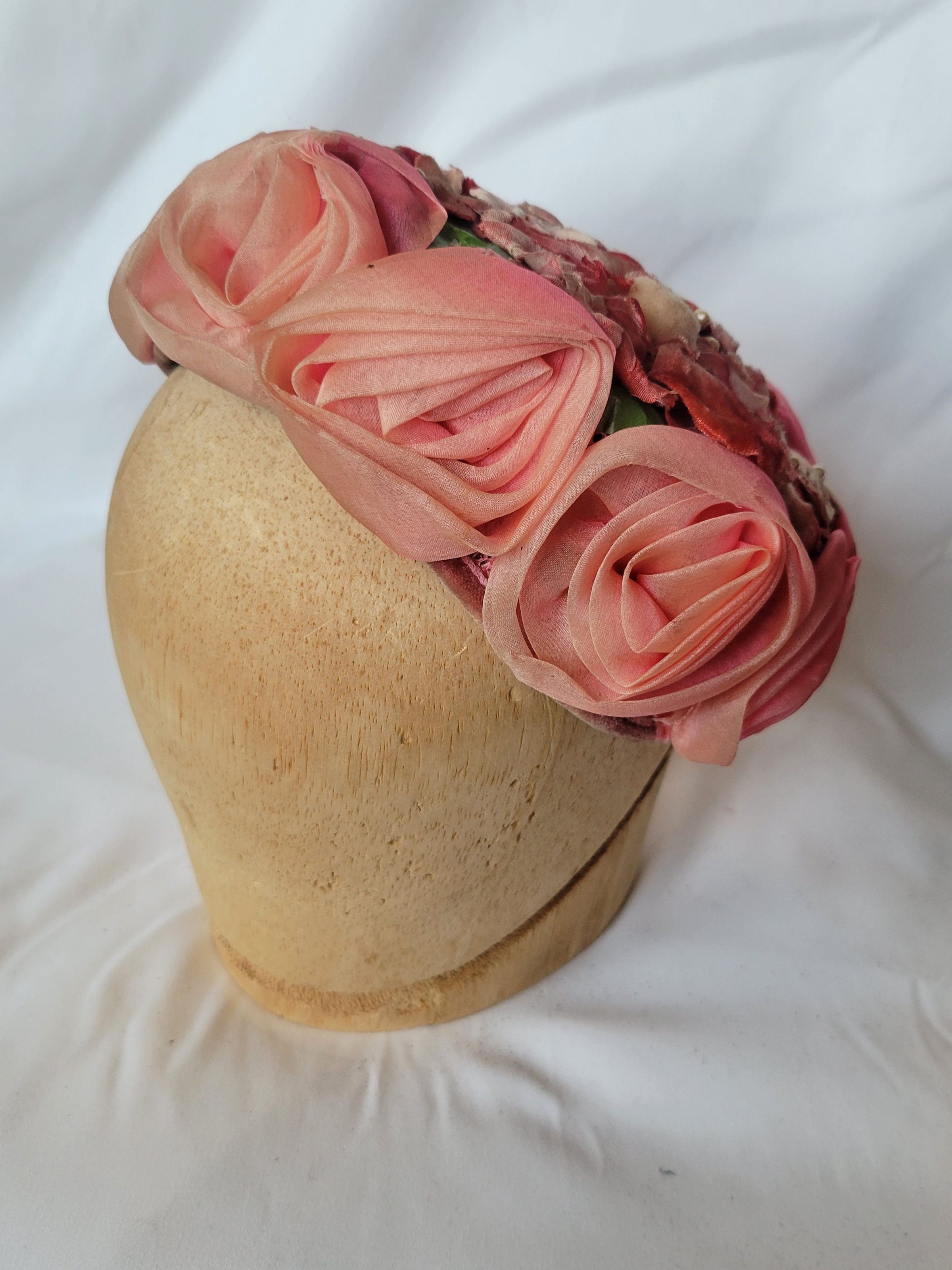 A pillbox hat with large pink rosettes around the outside and smaller pink flowers on the top. Pillbox hats came into fashion in the late 1940s, and while typically unadorned could be found with veils or flowers like this one.Collection