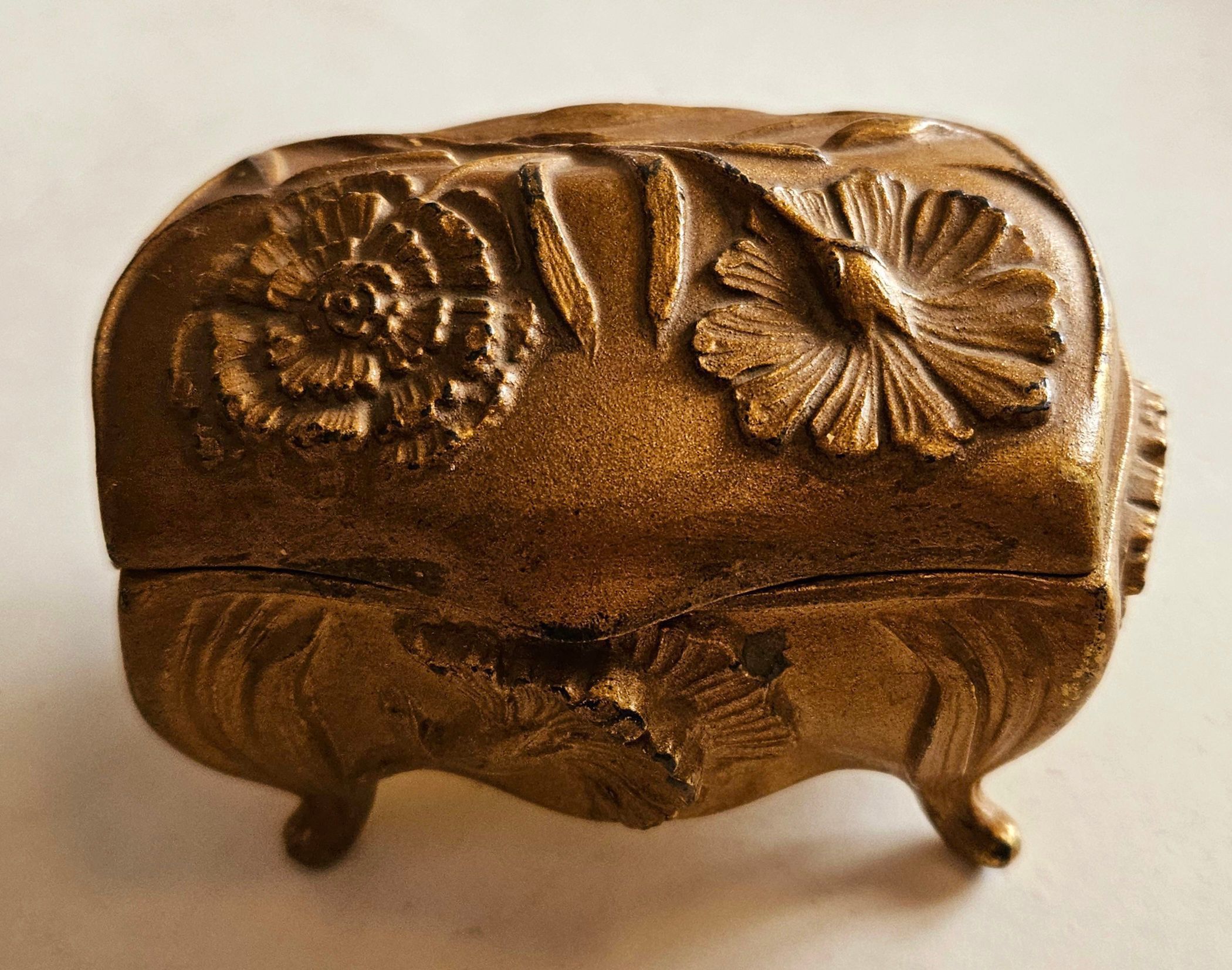 Metal jewelry case or box. An example of Art Nouveau, which flourished from c. 1890 until World War I. Donated with 40 other, similar metal jewelry boxes that belonged to the donor's late mother, who collected them. Eight of the jewelry boxes bear the mark JB. JB was the mark of Jennings Brothers of Bridgeport, CT. Edward (1863-1952) and Edwin Jennings founded the American Jewelry Company in Bridgeport in 1888. In 1890 they changed the name to Jennings Brothers. The company continued to manufacture fine metal items cast from molds: clocks, bookends, statues, metal cases, candelabras, and some silver plate. All Jennings Brothers products were labeled JB. In 1905, the company moved from its original small, wooden building to a larger building on Elm Street, a former gun foundry. Jennings Brothers went out of business in 1953. In the 1960s, its molds were sold to a company in Pennsylvania, which continued to use them, although the newer castings are not considered by collectors to be of good quality. Three others are marked B & W (Brainard & Wilson of Danbury, CT, 1909-1922). Two are marked W. B. Manufacturing Co. (Weidlich Brothers of Bridgeport, CT, 1905-1950; co-founder Charles E. Weidlich previously worked at the Wheeler and Wilson sewing machine company, also of Bridgeport). One is marked W & W. The others do not bear any readable manufacturer's marks.Item Type