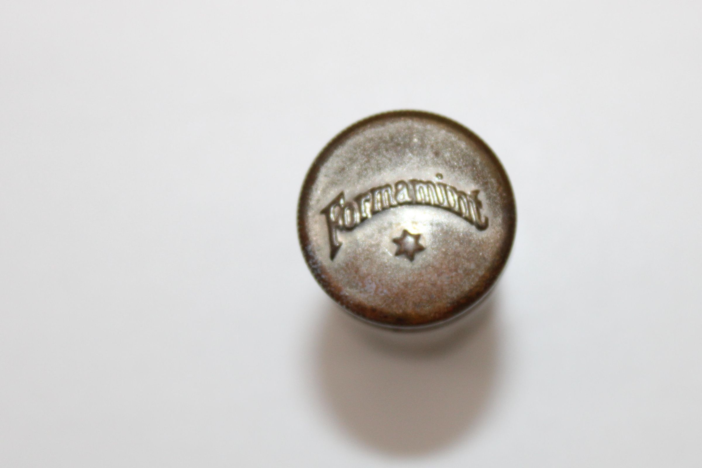 A small pill vial labeled "Wulfing's Formamint for Sore Throat" on the side of the canister and "Formamint" on the lid. Some pink powder is still present in the lid and vial both.Made/Created